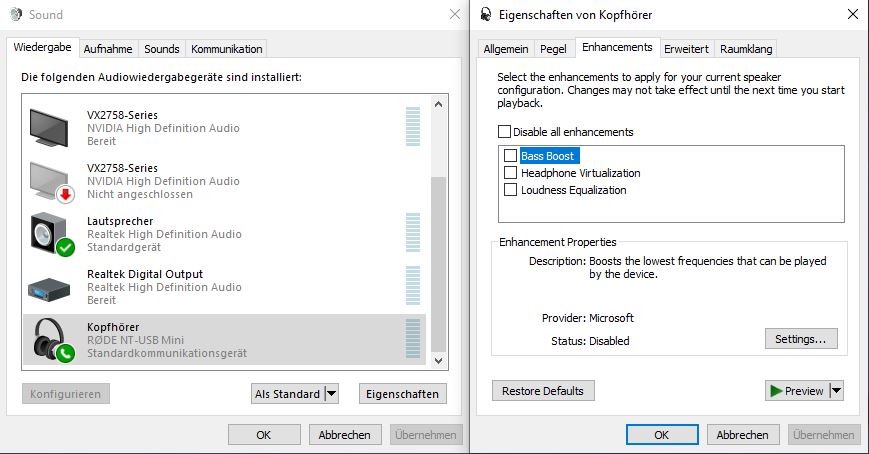 Ist der Kopfhörerverstärker des Rode NT-USB Mini mit so einem oben erwähnten 30 Euro Kopfhörerverstärker zu vergleichen? Sollte der Sound des SHP9500 angeschlossen an das Rode USB Mini nun hörbar besser sein, als direkt angeschlossen an meinem PC (ohne Soundkarte, DAC oder so)? Dachte der Kopfhöreranschluss sei nur fürs Live-Monitoring...wohl doch nicht, da man dafür den Regler vorne drücken muss.