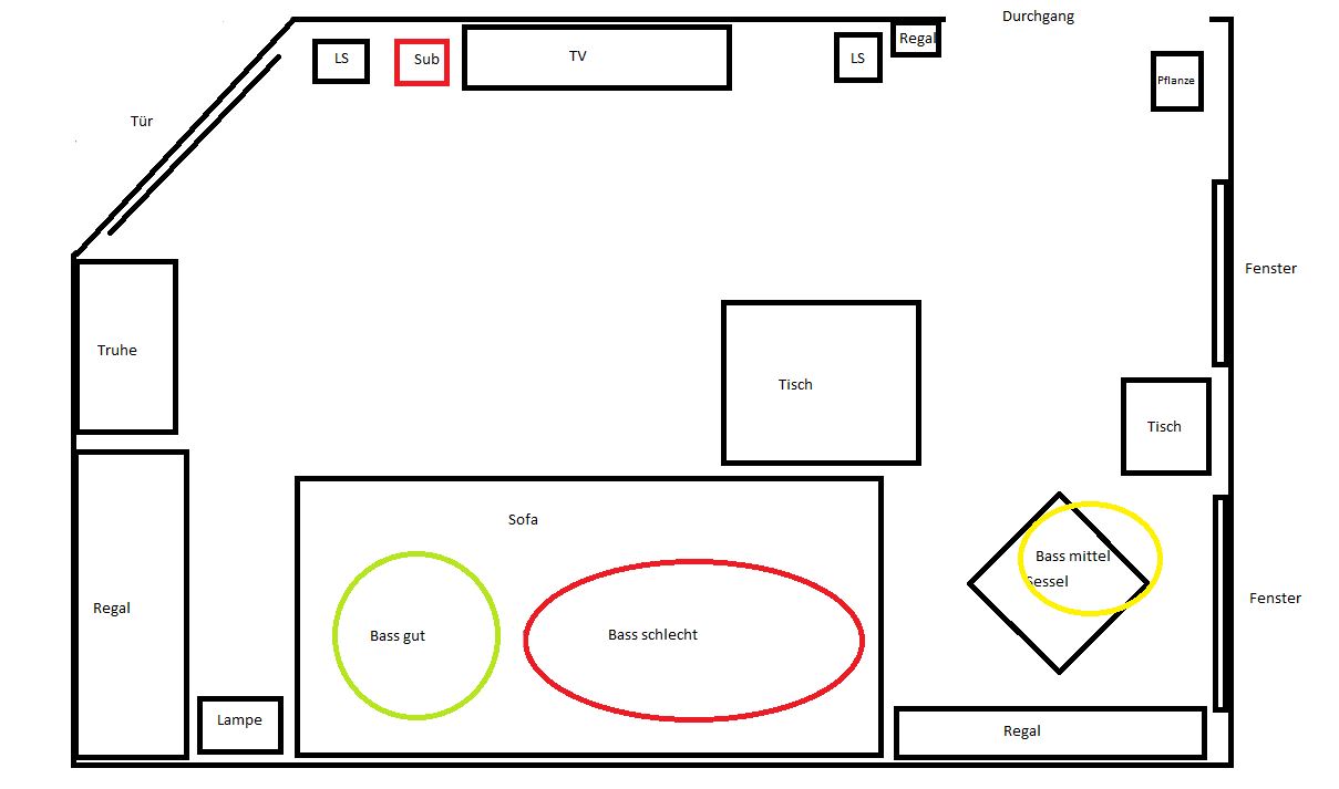 Der Subwoofer befindet sich links zwischen Front LS und TV. Rechts neben dem TV wäre der einzig mögliche alternative Platz, der klingt aber eher schlechter als der aktuelle.