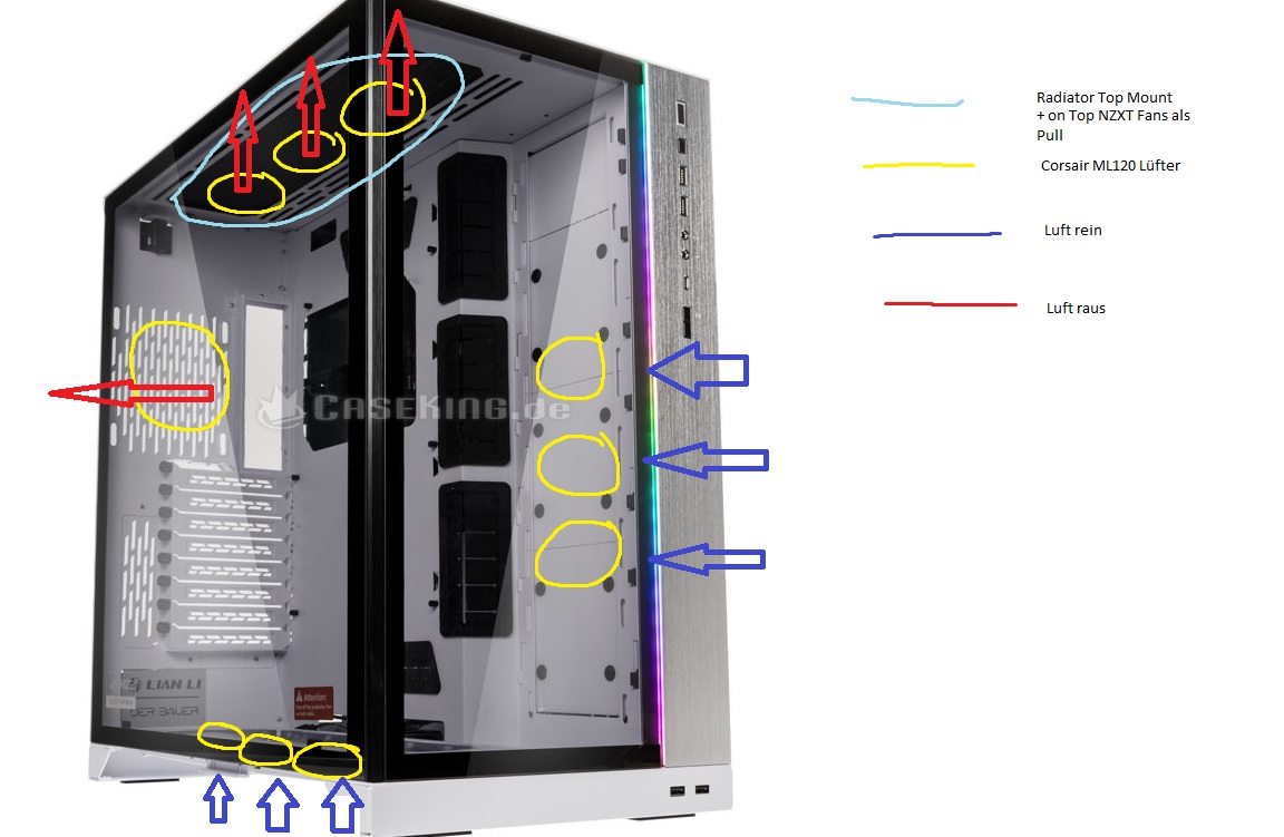 Über den hinteren Teil (1x 120mm Corsair ML120 RGB) sowie über die AIO (Top Mount) soll die Luft dann wieder aus dem Gehäuse raus.
