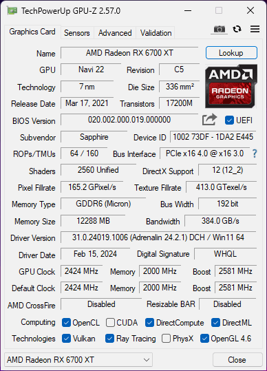 GPU: 12GB Sapphire Radeon RX 6700 XT