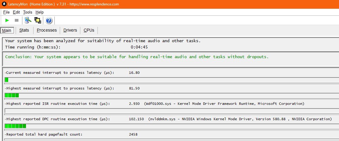 Meine eigene DPC ging von Katastrophe auf 10-50 us runter, recht konsistent, mit der einen oder anderen Spitze bei so 80us alle 60-80 Sekunden. Nichts mehr über 81 bei den ersten 2 Meßwerten auf Reiter 1.