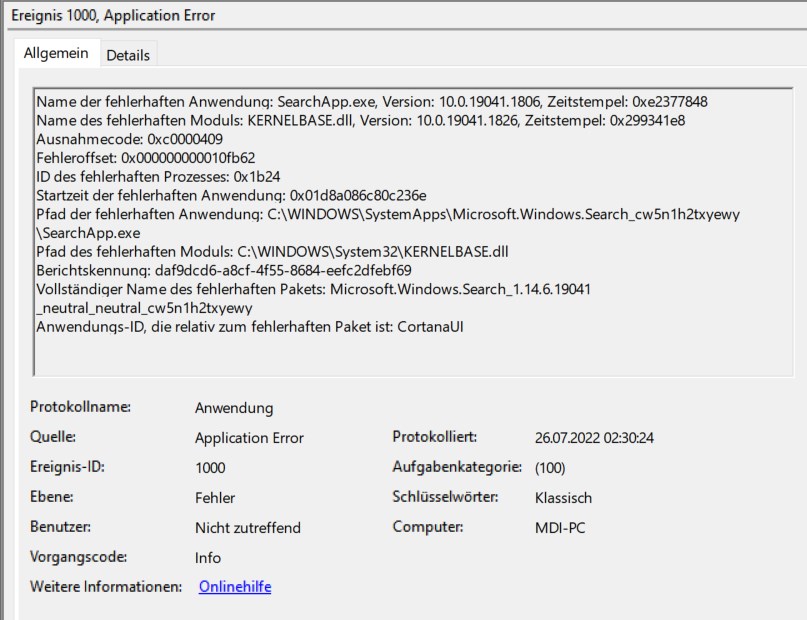 - 29.04.2022, zwei Stunden später: explorer.exe (DUI70.dll), wenige Sekunden später auch KERNELBASE.DLL Meldung (SearchApp.exe)