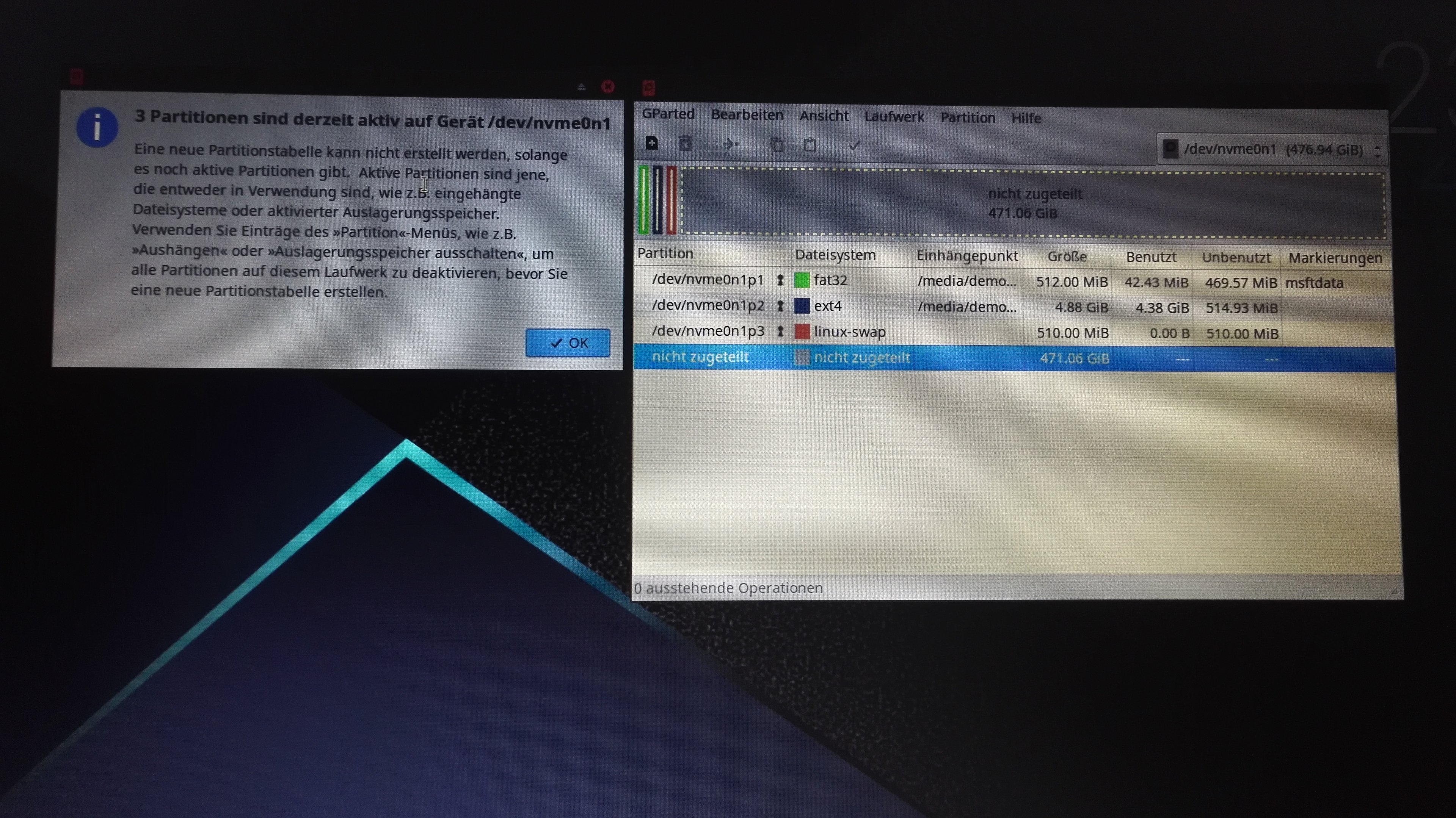 Dann von Linux aus die Festplatten Partitionen gelöscht und die