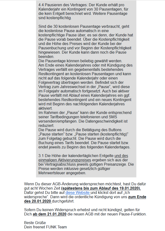 @nlr es gab erneut Änderungen an den AGB, die Mitte Januar in Kraft treten. Kurz: man kann den Tarif nicht mehr kostenlos für 14 Tage pausieren. Zukünftig hat man pro Jahr 30 kostenlose Tage zum pausieren, will man darüber hinaus den Tarif pausieren, so kostet es 29 Cent. Screenshots der Mail anbei.
