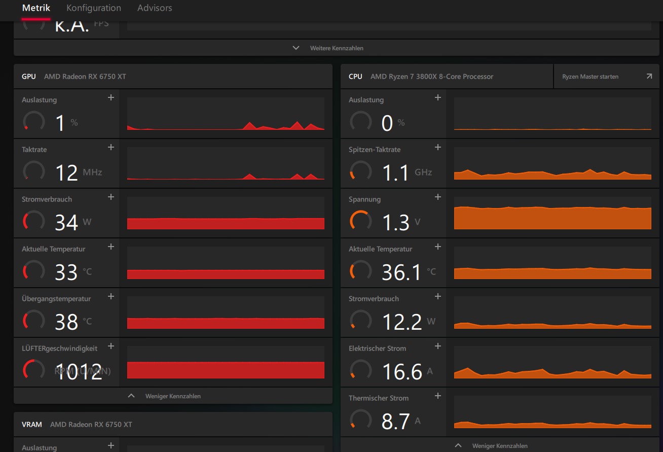 Temperaturen sind laut Adrenalin Software aktuell bei im IDLE: GPU: 39Grad & CPU: 36Grad