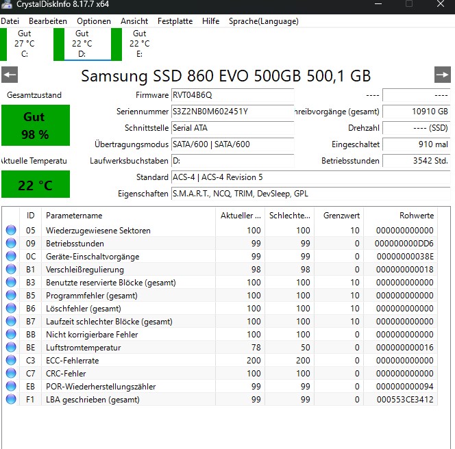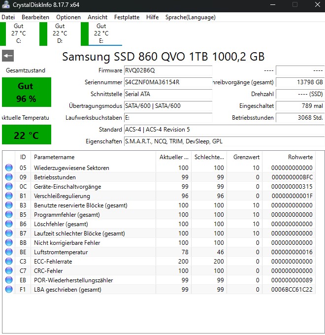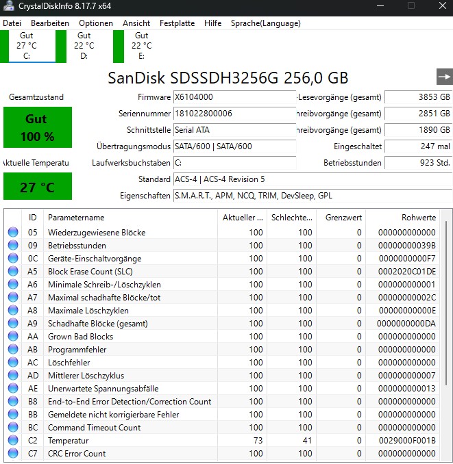 CrystalDisk sagt -> Zustand Gut von allen 3 SSD's (siehe Bilder)