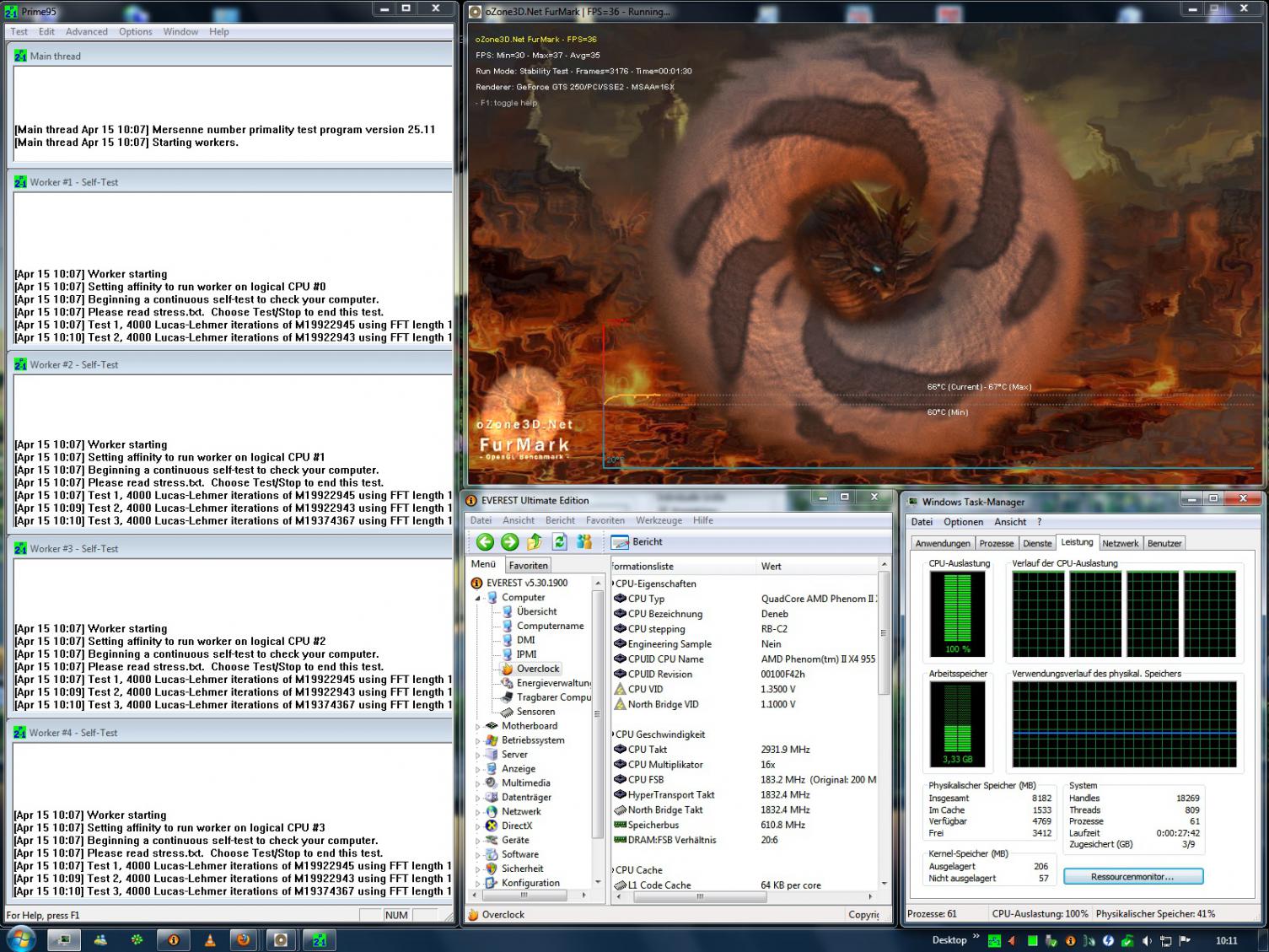 Sooo... FurMark lief gestern im Stabilitätstest mit 1600x1200, MSAA Qualität 16x im "Extreme Hitze Modus" für (Achtung) knapp 1 Stunde & 30 Minuten (war laufen und hatte ganz vergessen das FurMark läuft). Die höchste dort erreichte Temperatur war 71 Grad (jo, nen Antec Skeleton Gehäuse eben, da wirds nicht wirklich warm). 3DMark06 sowie Vantage liefen ebenfalls mehrfach ohne Probleme, Spiele laufen auch...