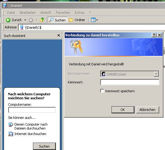 Ich hab nen neuen Rechner und bin den nun am einrichten. Damit ich nicht das Zeugs einfach hin und her schieben kann habe ich extra ein Kabellan zusammen gesteckt und die komplette C Platte freigegeben. Drauf komme ich auch, in den Ordner Documents & Settings ebenso. Aber beim Benutzernamen ist Schluss. Darf ich nicht:-( An beiden Rechnern bin ich mit dem selben Benutzernamen und Passwort angemeldet.