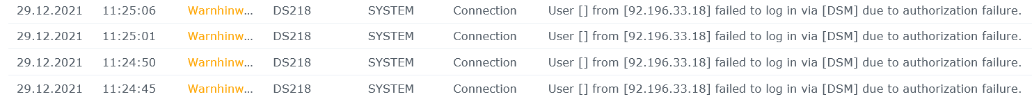 Hallo, ich habe eine Synology Quickconnect Domäne zur Erreichbarkeit meiner NAS und nutze diese seit seit über einem Jahr. Vor zwei Wochen hatte ich nun das erste Mal vier versuchte Anmedlungen der IP 80.27.230.15 und heute wieder vier von 92.196.33.18. Ich verstehe gar nicht wie man meine Domäne von Synology finden kann? Das ist doch wie die Nadel im Heuhafen. Muss ich mir sorgen machen?