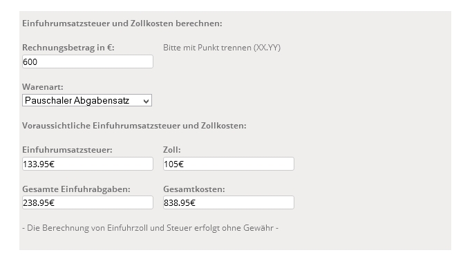 ich war unlängst auf Urlaub in Ägypten. Ich habe dort das Kitesurfen gelernt. Wir haben uns mit unserem Kitesurflehrer angefreundet. Dieser betreibt nebenbei einen Handel mit allen möglichen Produkten rund ums Kitesurfen. Tatsache ist, dass er mir einen brandneuen Schirm für ca. 600€ verkaufen würde. Der Neupreis hier wäre ca. 1500€. Das Vertrauen für den Deal ist auf jeden Fall gegeben. Ich frage mich nur. ob und wieviel an Zollgebühren anfallen, sollte ich mir das Kite von Ägypten nach Österreich schicken lassen. Es wäre ein ca. 60x40x40 (HöhexBreitexTiefe) großes Paket, es würde ganz normal verpackt sein und (ohne Kennzeichnung als Handelsware oder dergleichen) von Privat an Privat verkauft werden.