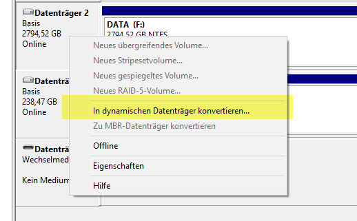 Entweder stimmt was mit der 3TB Partition nicht obowhl ich gerade sehe, sie sei in GPT formatiert? Aber warum könnte ich sie in einen dynamischen Datenträger konvertieren nach Windows?