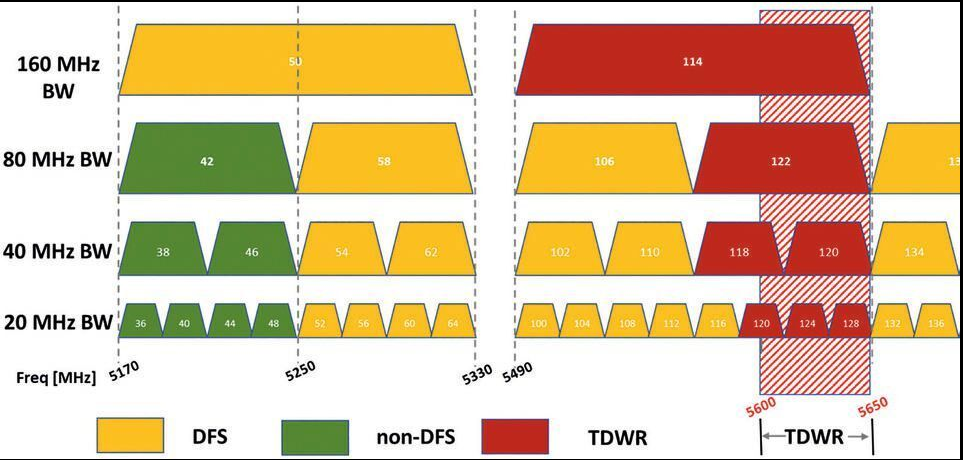 5-GHz-Band für 1 Min. auf dem gewählten Kanal 132-136 (Frequenz 5.660-5.680 GHz) nicht nutzbar wegen Prüfung auf bevorrechtigten Nutzer (z.B. Radar).