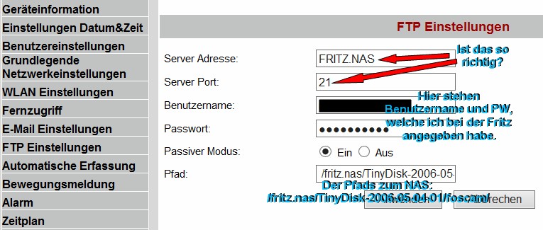 Wie schaffe ich es "im heimischen Netzwerk", dass die Kamera die Aufzeichnungen per FTP an den Stick der Fritz sendet?