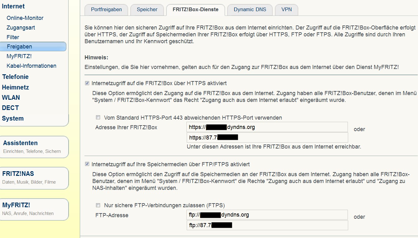 - Unter Fitzboxdienste habe ich die Zugriffe über HTTPS und FTP/FTPS aktiviert