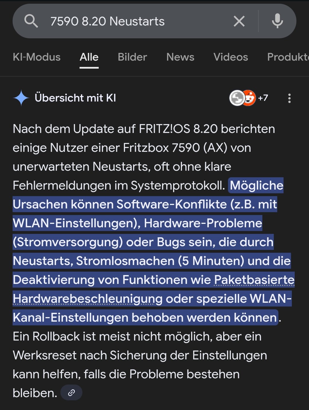 Hat jemand seine 7590 schon bei der DSL-Synchronisierung beobachten können? Hatte gerade erstmalig das Vergnügen, meist passiert das laut Ereignissen in der Nacht. Ich dachte, jetzt ist sie gestorben. Alle LEDs aus, dann fingen sporadisch Power und WLAN wild und unregelmäßig an zu blinken, zwischenzeitlich auch nur kurze Zuckungen der LEDs oder komplett dunkel. Die SSD am USB Port ebenfalls aus.