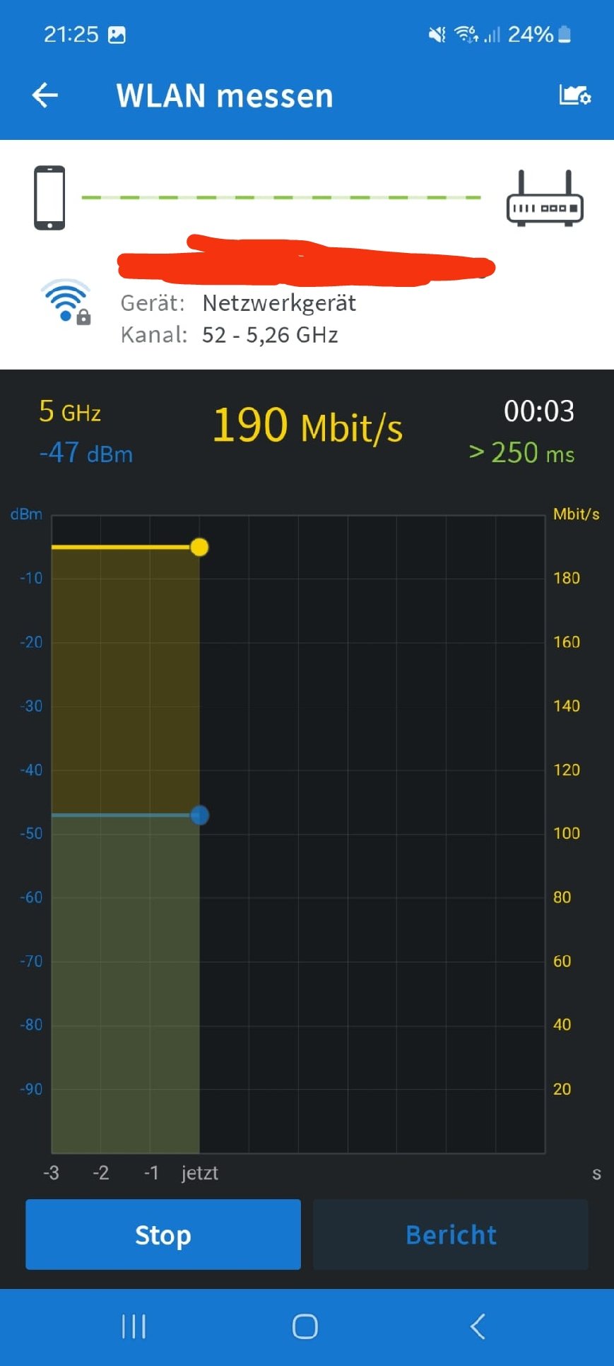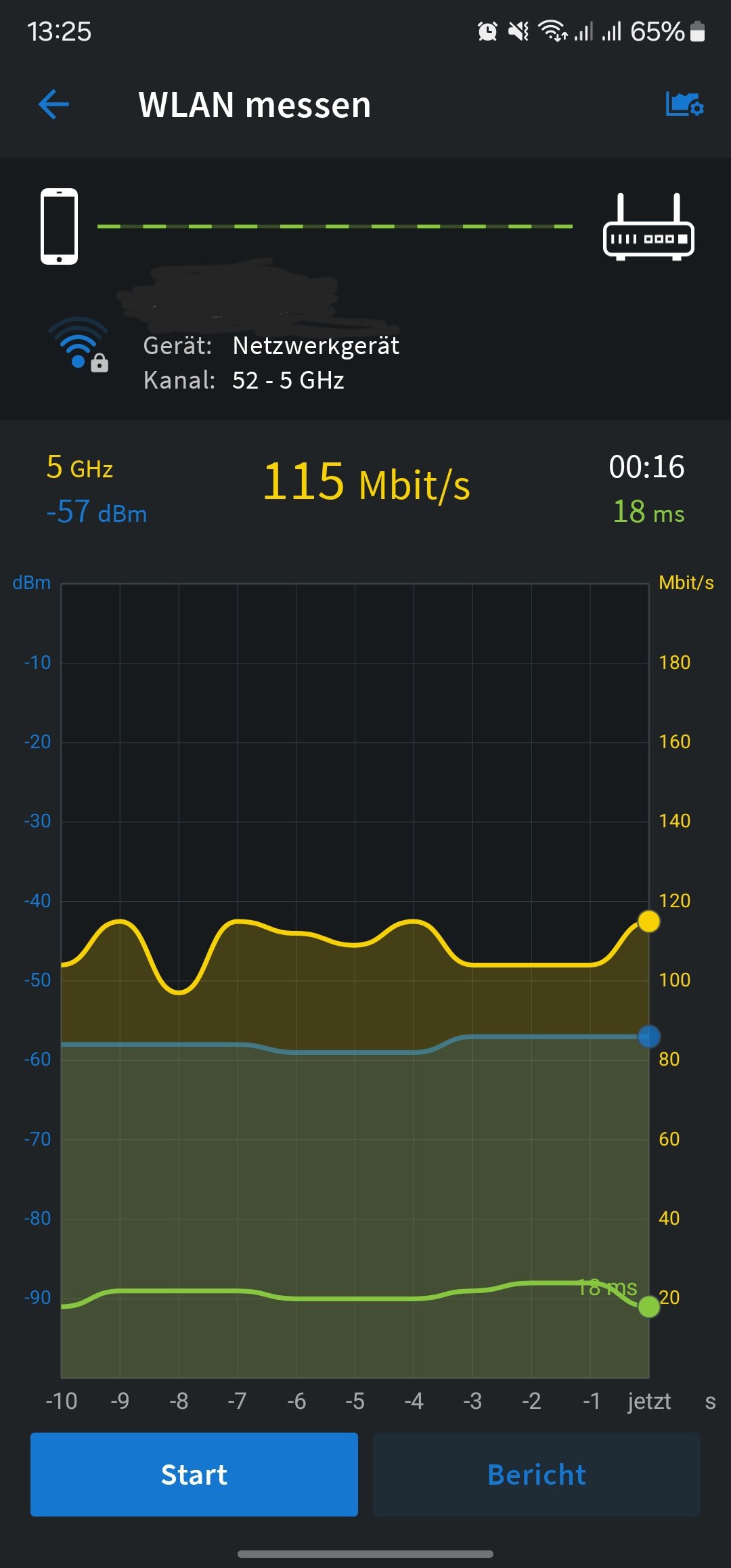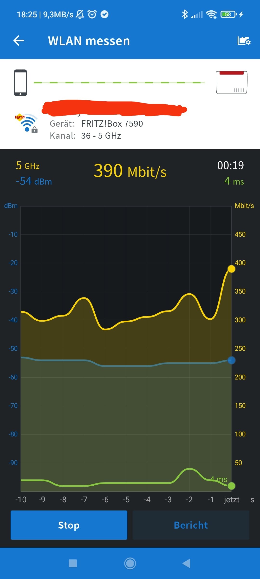 Auf meinem Handy läuft die AVM FRITZ!App, die ich auf Außendiensten hin und wieder nutze, um auf schnellem Wege zu prüfen, ob in dem jeweiligen Raum, in dem ich mich gerade aufhalte, gemäß unseren Vorgaben eine ausreichende WLAN-Stärke vorhanden ist.