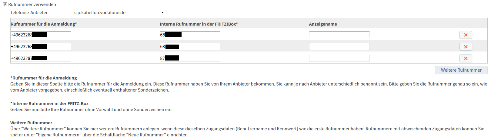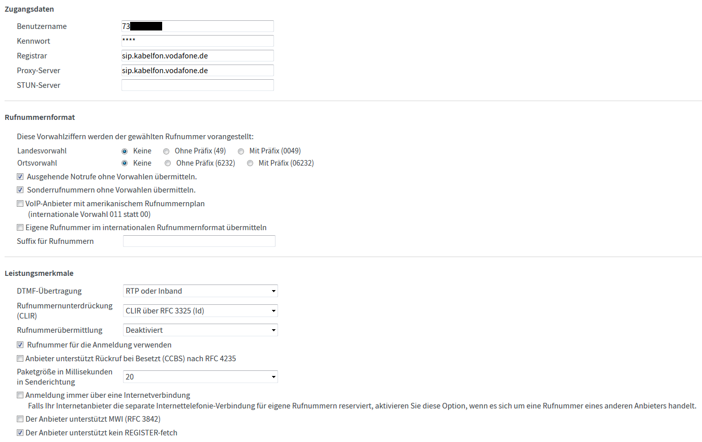 Haben einen Kabelanschluss von Vodafone Kabel (ehemals Kabel Deutschland) mit Telefon und Internet und habe vor kurzem die FRITZ!Box 6490 Cable bei uns im heimischen Elektrohandel gekauft, da seitdem 01.08. die Routerfreiheit herrscht und das Hitron-WLAN-Kabelmodemrouter von KDG unzureichend für unsere Verhältnisse ist. Habe dann die Kabelfritte angeschlossen, gewartet bis diese gesynct hat und habe dann die Aktivierungsseite für Fremdrouter am PC aufgerufen und einen Aktivierungscode angefordert und danach wieder das Hitron angeschlossen. 3 Tage später kommt der Code mit der Post an, ich schließe wieder die Kabelfritte an, gehe zur Aktivierungsseite gebe Kundennr. und Aktivierungscode ein und habe dann die ganzen SIP-Zugangsdaten erhalten, die ich gleich als PDF gespeichert habe. Diese Zugangsdaten habe ich dann in die Kabelfritte eingegeben und die Rufnummern registriert.