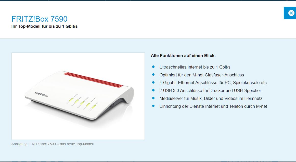 @TheCadillacMan hatte entdeckt, dass die Münchner Firma M-Net, die in München das ist, was NetCologne hier in Köln. die Fritz!Box 7590 ihren Kunden als offizelle Router anbietet. Sie schreibt in Ihrer Produktbroschüre für dieses Angebot die Standards und Protokolle soweit ich das beurtelien kann, genauso, wie es jetzt auf meiner Fritz!Box 7360 angezeigt wird: