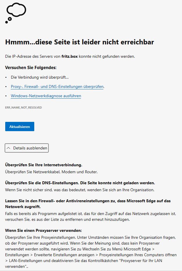 ich habe jetzt seit einigen Wochen das Problem das ich mich mit meiner Fritz Box 7530 manchmal nicht anmelden kann. Wenn ich die Seite fritz.box aufrufe dann öffnet sich oft diese Seite: