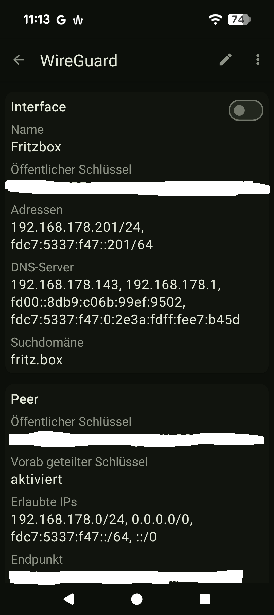 Nun möchte ich gerne mein Google Pixel 9a Android Handy über ein Wireguard-VPN mobil mit der Fritz!Box verbinden. Das habe ich nach Anleitung gemacht und es funktioniert auch.