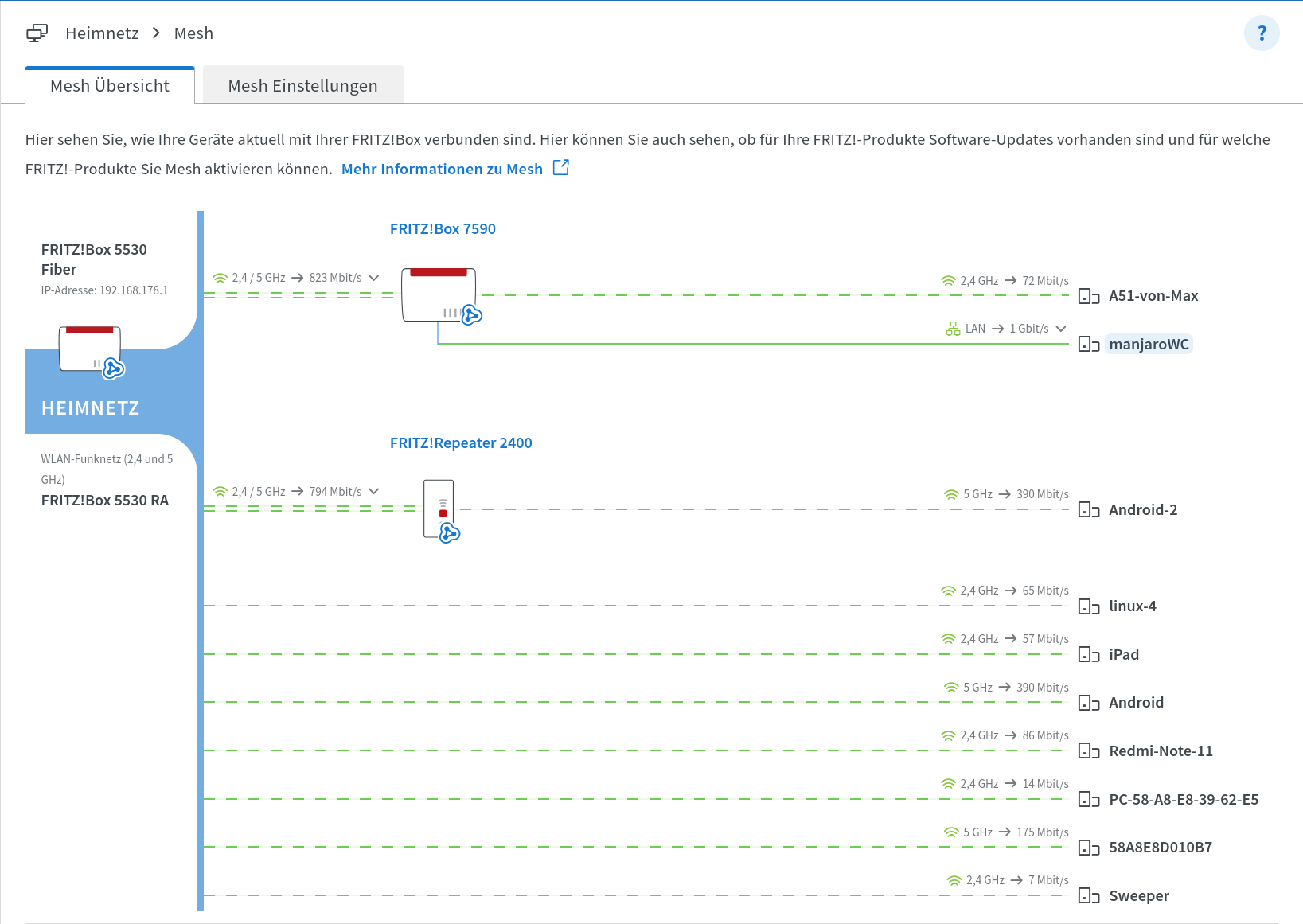 vor gut einem Jahr wurde bei uns ein Glasfaseranschluss installiert. Mein Vater hat daraufhin ein Angebot der EWE mit 300 Mbit/s Download und 80 Mbit/s Upload abgeschlossen. Als Router nutzen wir eine Fritz!Box 5530 Fiber. Zusätzlich ist eine Fritz!Box 7590 als Mesh-Repeater eingebunden, ebenso ein FRITZ!Repeater 2400.