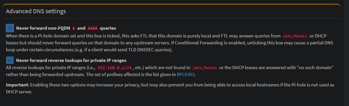 Als nächstes habe ich im Pihole das "conditional forwarding" aktiviert, indem ich dort nach Vorgabe meinen IP-Bereich und die IP des DHCP (Fritzbox) eingetragen habe.