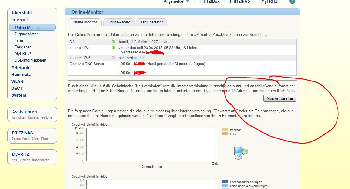 ich wollte eben meine Fritzbox über die Benutzeroberfläche im Browser neu verbinden lassen (zwecks IP Änderung), nur leider hat das letzte Firmwareupdate den Button zum "Neu verbinden" entfernt.