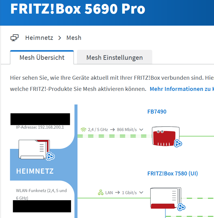 7490 ist danach mit der 5690 Pro mit 192.168.200.x verbunden, ohne Mesh Symbol.