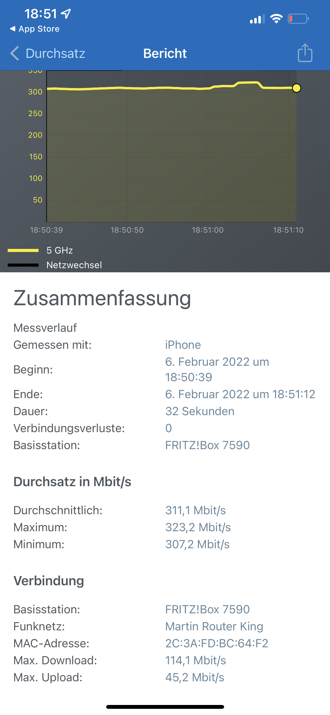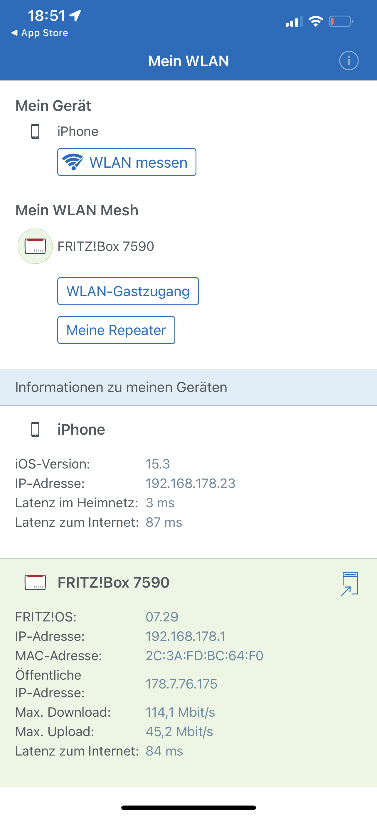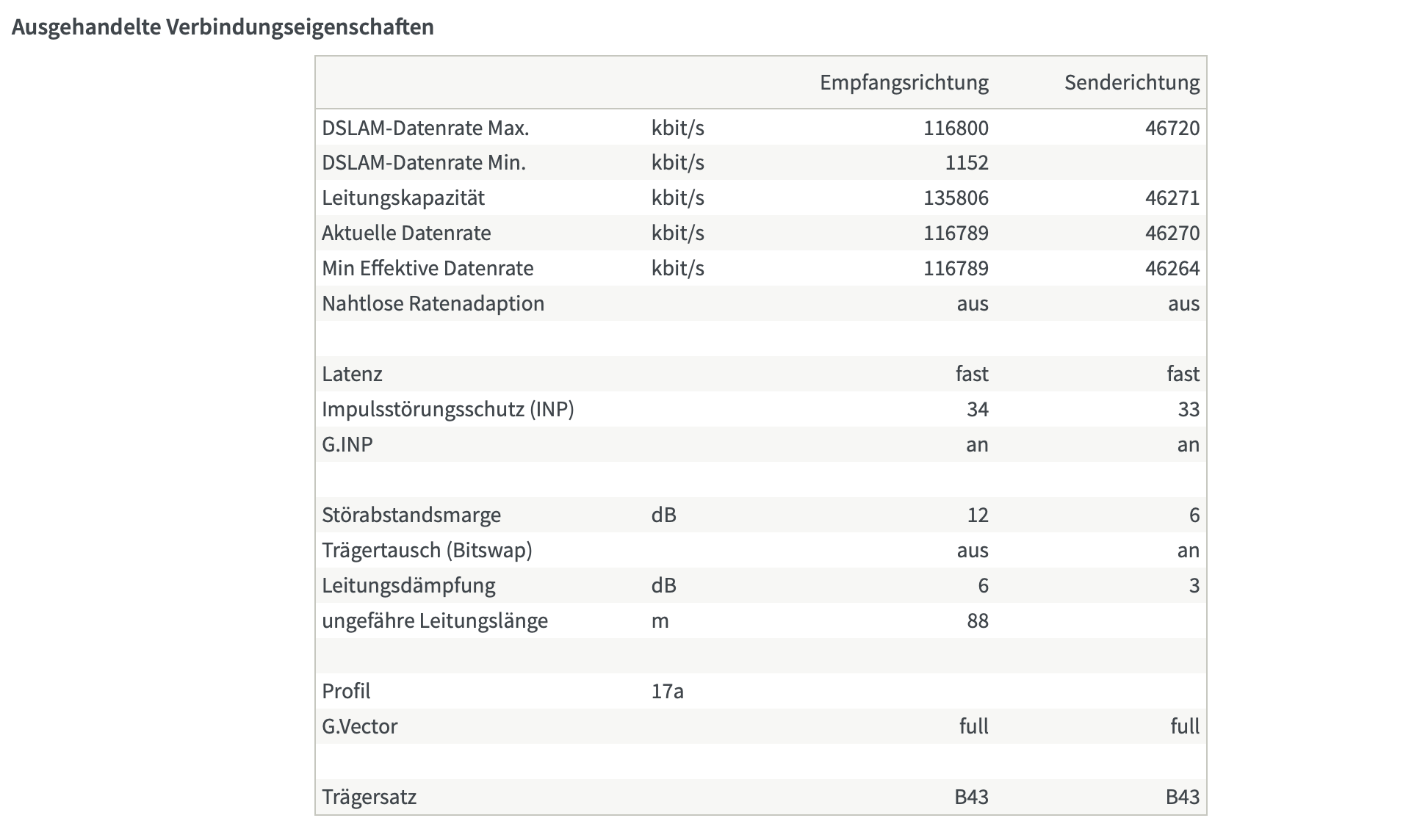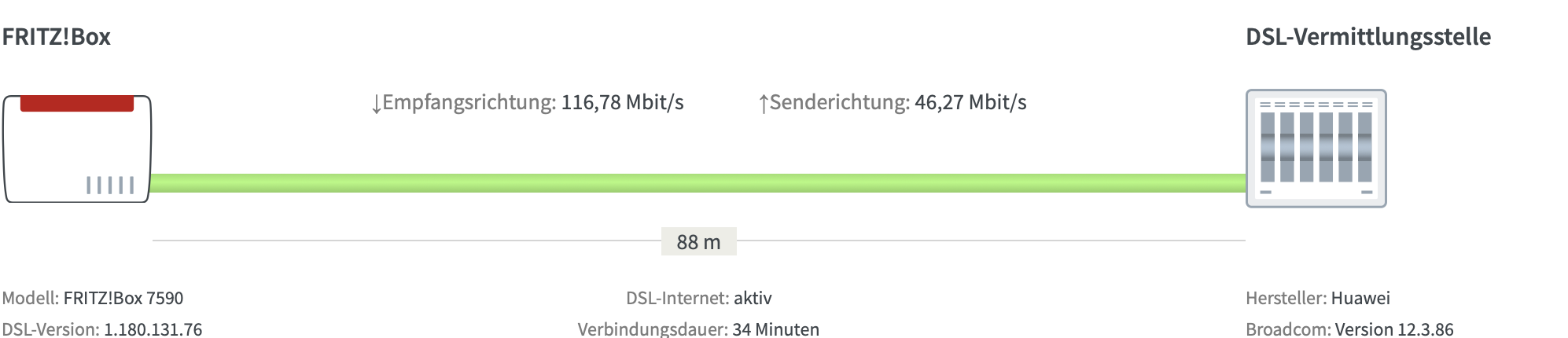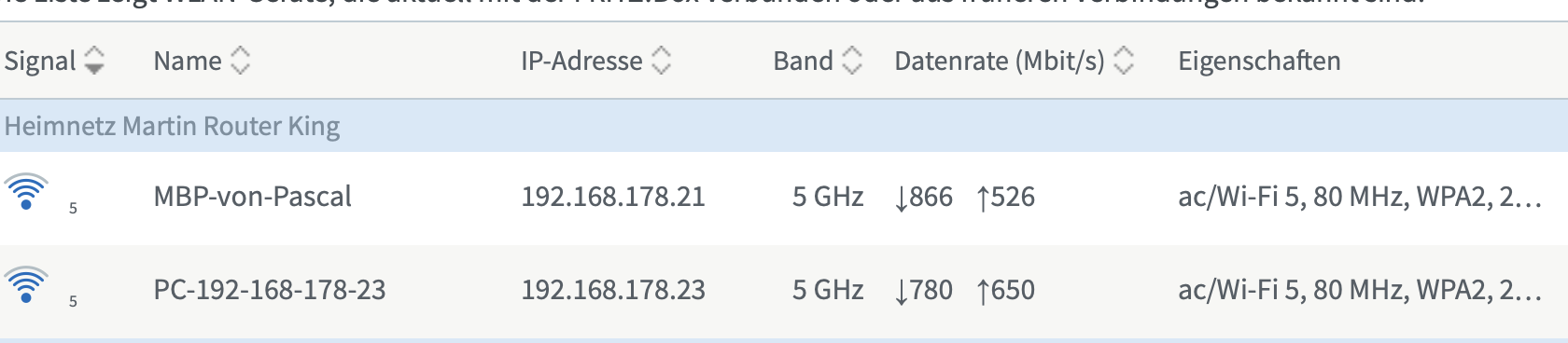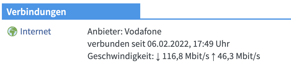 In der Oberfläche von der Fritz!Box stehen unter den DLS Information die vom Anbieter versprochenen Raten. Unter den W-Lan einstellungen zeigt er mir auch an mit welchen Daten er raus schickt aber diese kommen nicht ansatzweise an mein Macbook an. Auch nicht am iPhone.