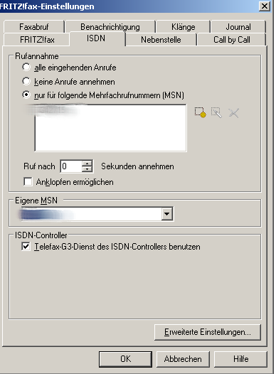 AVM ISDN-Controller FritzCard unter dem Reiter ISDN eine MSN zu vergeben, falls noch nicht gemacht.
