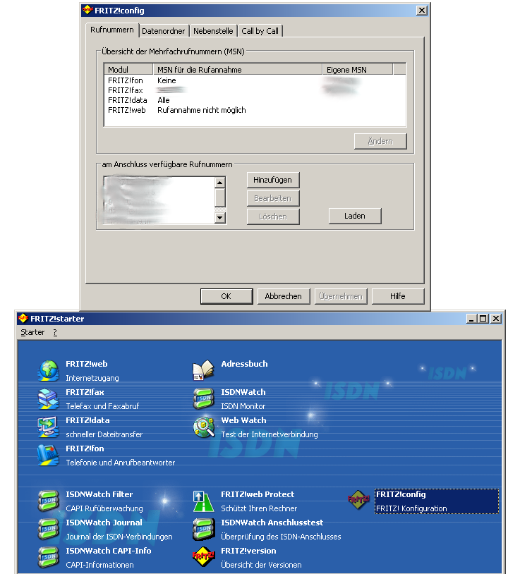 Dann geh mal in die Konfiguration und stell ein welche MSN für welches Gerät zuständig ist. Starte Fritzfax, dann auf Fax, Einstellungen, ISDN, da trägst Du die Nummer (MSN) ein die für die Faxannahme benutzt werden soll, dazu den Haken setzen bei "nur für folgende MSN annehmen", unter eigene MSN trägst Du dann auch diese Nummer ein. Das gleiche machst Du ebi den anderen Programmen die Du von Fritz benutzt. Wenn Du ISDN Watch benutzt, kannst Du beim doppelklick aufs Icon in der Taskleiste ein Menü öffnen, da wählst Du dann Fritzkonfig aus und kannst den Programmen die MSN zuweisen, wenn Du sie zuvor geladen hast.