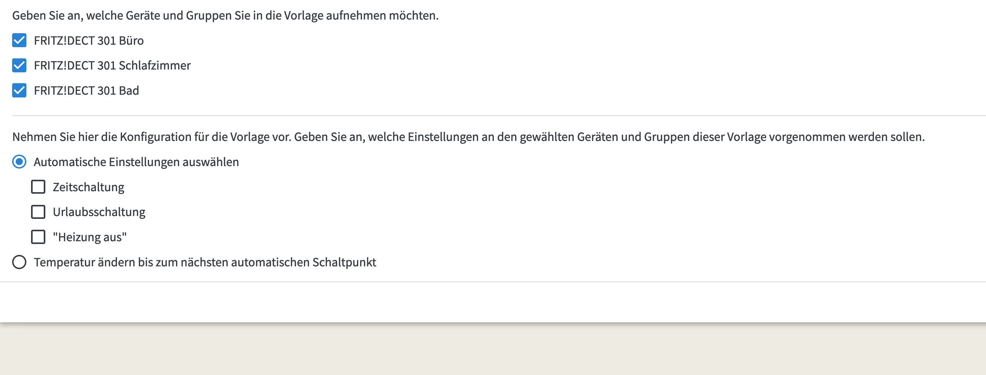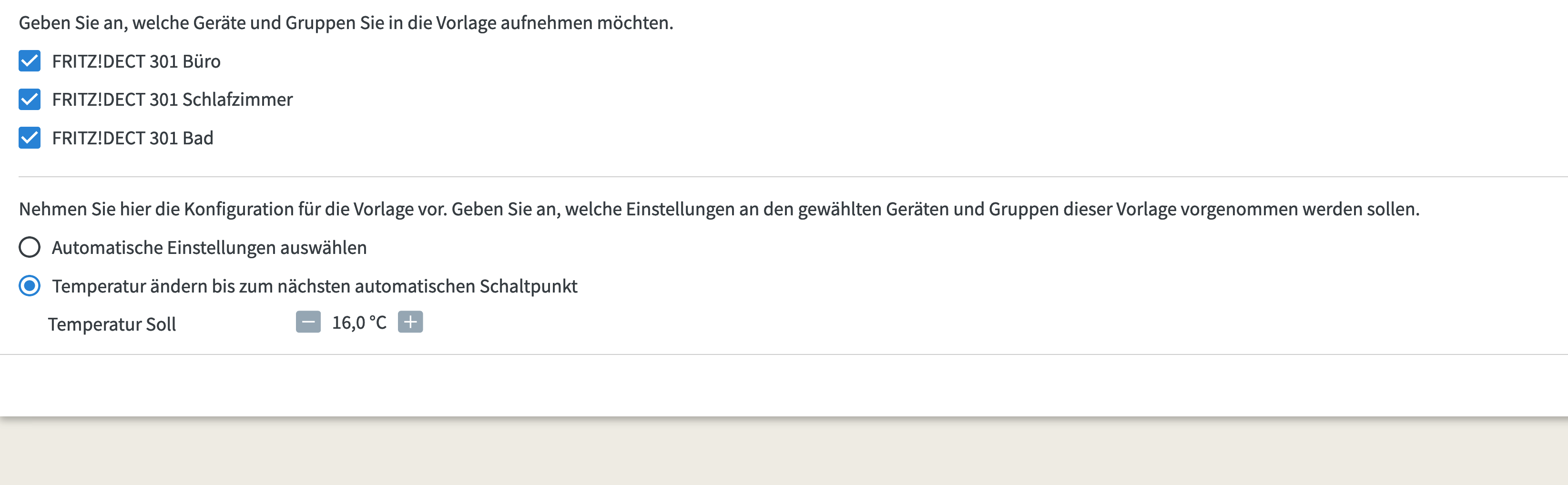 Da es ja kein Geofencing gibt, dachte ich man kann zumindest eine Vorlage erstellen, womit man beim verlassen des Hauses alle Heizkörper auf die im Zeitschaltplan definierte Absenktemperatur stellt und dann mit einer weiteren Vorlage zur Heiztemperatur zurückkehrt.