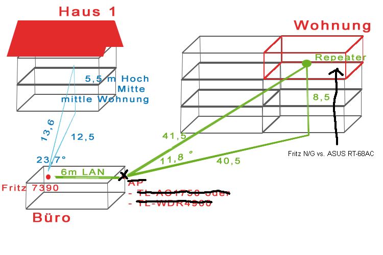 Vor einien Wochen hatte ich den T-Link Archer C7 getestet und aufgrund von ständigen Verbindungsabbrüchen zurückgeschickt. Anbei eine grobe Skizze der Infrastruktur. Der Repeater verbindet sich direkt mit Fritz 7390.