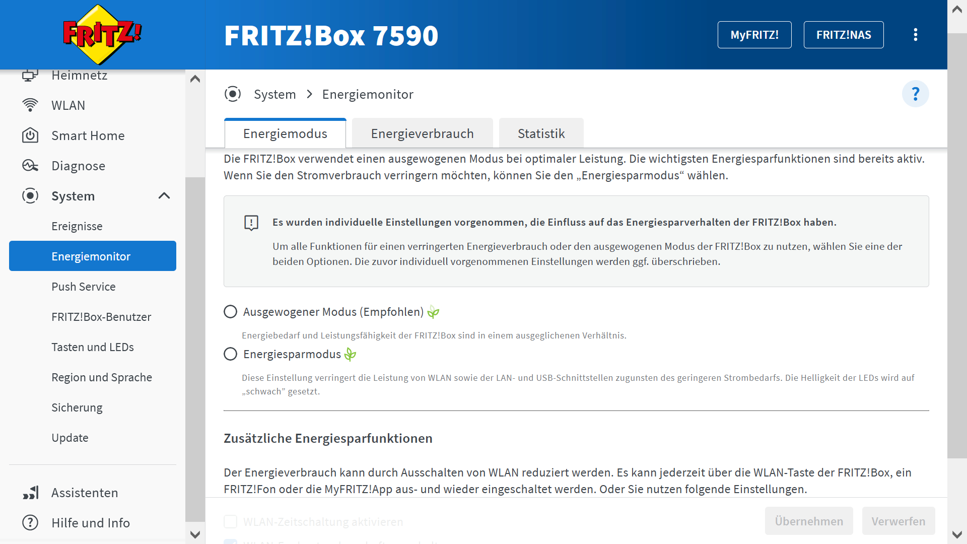 Ich habe die Fritz!Box 7590 mit der derzeit aktuellen Fritz!OS Version 7.56 drauf installiert. Als ich das Update auf die aktuelle Version machte lief auch alles soweit gut und besonders gespannt war ich auf den neuen Energiesparmodus. Und dazu hätte ich gleich eine Frage: Die Einstellungen (siehe angehängten Screenshot) kann ich auf den ausgewogenen Modus setzen und auf den anderen Energiesparmodus. Wenn ich mich jetzt für den "Energiesparmodus" entscheide und diesen anklicke (hat dann einen blauen Kreis) und auf "Übernehmen" klicke dann kommt kurz die Ladeschnecke und dann sieht es wieder genauso aus wie auf dem angehängten Screenshot. Sollte es da nicht ein Merkmal geben dass dieser Modus nun wirklich aktiv ist z.B. indem dieser markiert bleibt? Oder ist das richtig so und der wurde übernommen. Mir kommt es so vor als könne ich da nichts ändern?!