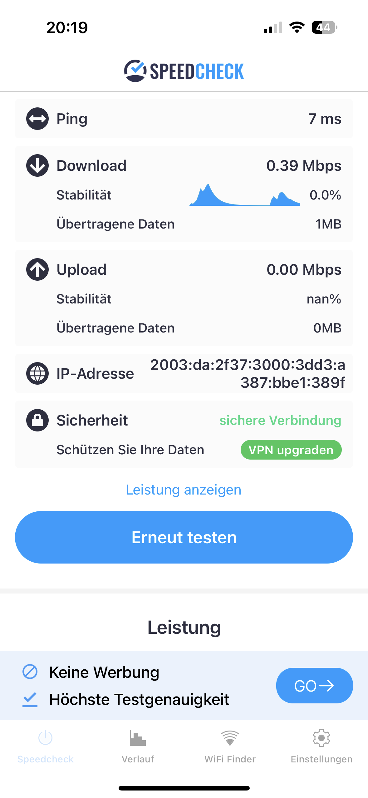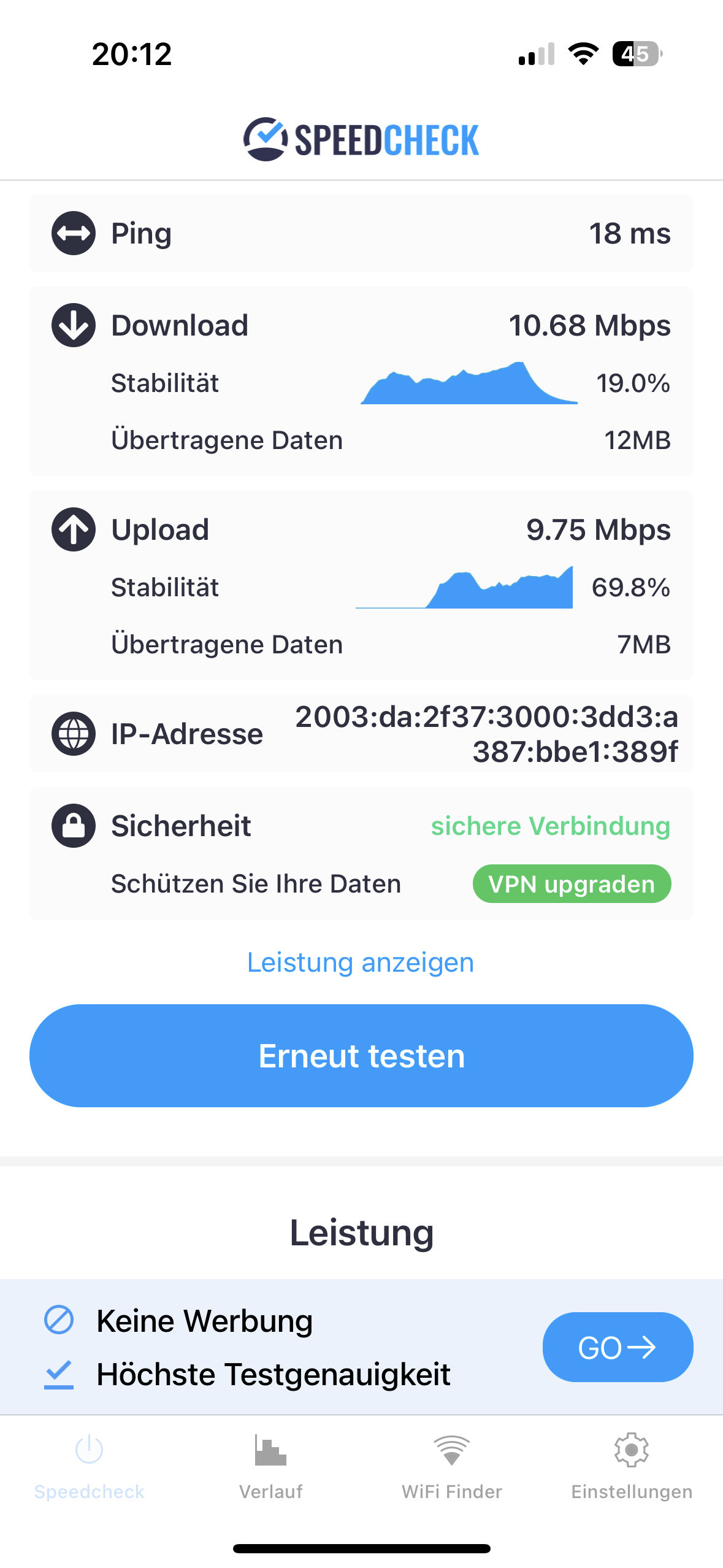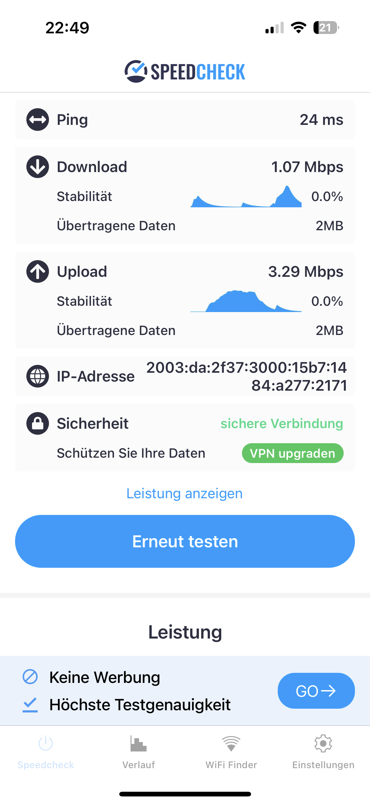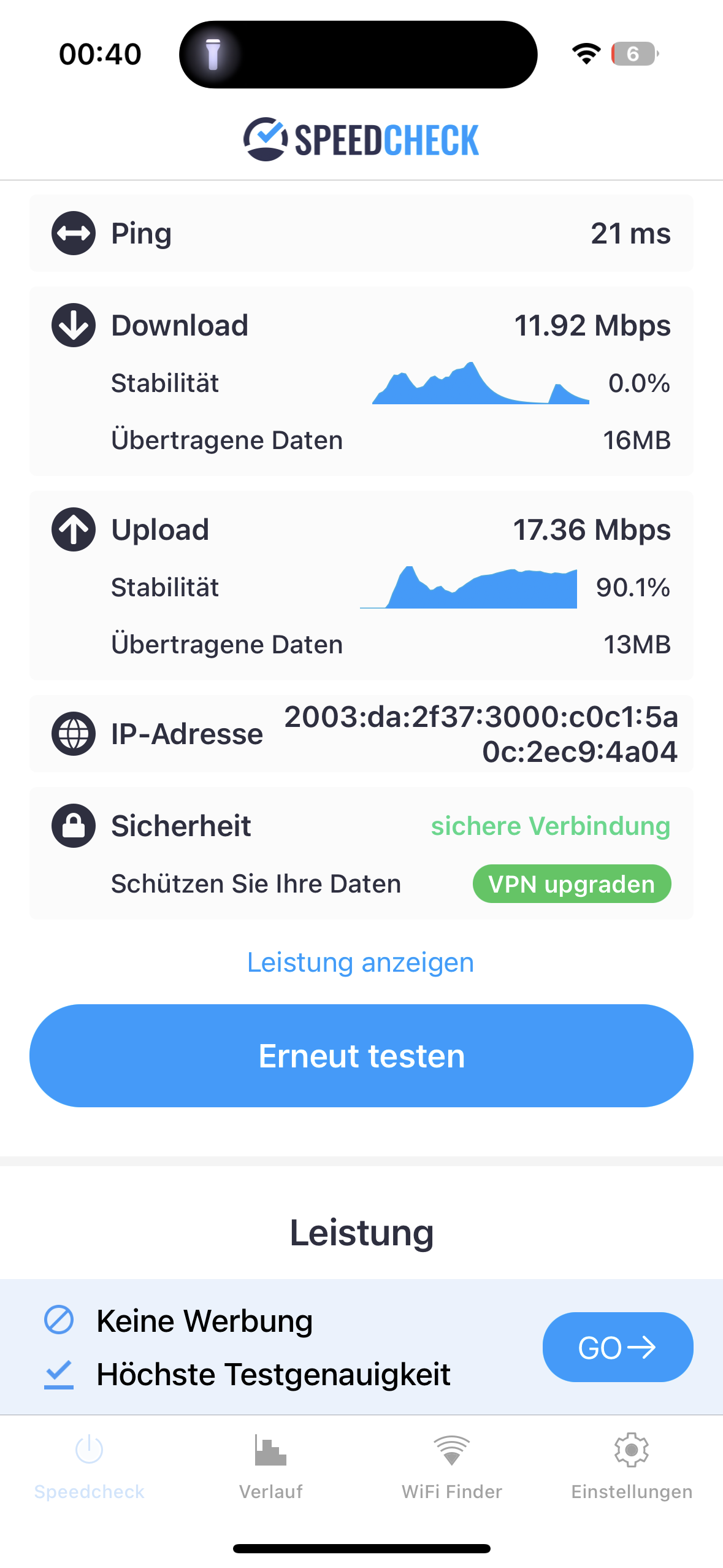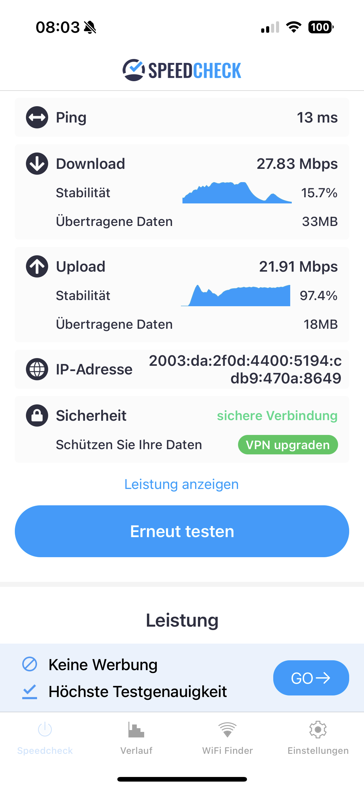 Wenn ich mit dem Handy in der Wohnung einen Speedcheck des Internets mache, dann habe ich 105 mbps down und etwa 50 Mbps Upload.
