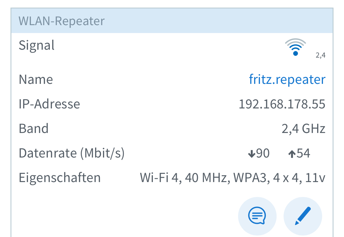 Ich habe eine FRITZ!Box 7590 AX und wohne im 1. Stock. In der Garage, welche sich im Keller (1. UG) befindet, habe ich einen Computer und esp32 Chips in Verwendung (für Autodarts, also einem automatischen Dartzählsystem). Leider reicht das WLAN nicht bis in den Keller, bzw. Die ESP haben einfach sehr wenig wlan Empfang, da sehr klein, also musste ich auf einen Fritz Repeater 2400 zurückgreifen. Dieser hat auch eine gute Verbindung zum Router (Laut App, siehe Bild)