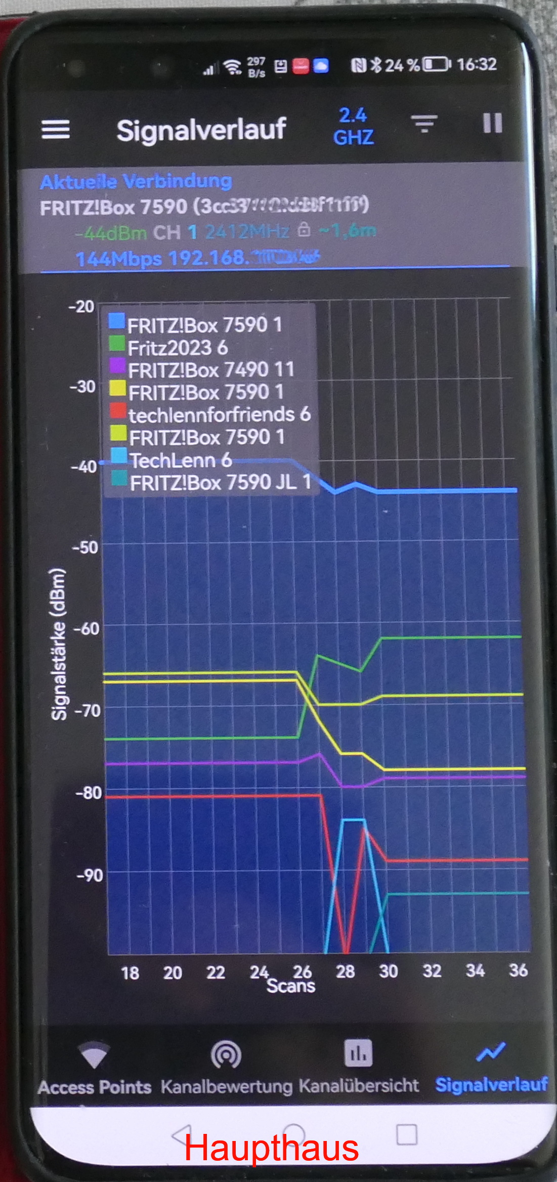 ich bin da über ein merkwürdiges Phänomen gestolpert, aber erst einmal zum Hintergrund. Im Haupthaus (Backstein) werkelt eine Fritzbox 7590 im zweiten Stock. Im EG ist einer der Fritzbox Repeater. Unser Hof ist > 10m lang; in der Mitte sitzt draußen ein weiterer WLAN Repeater von Fritz. Das Nebenhaus (Fachwerkscheune) beherbergt im EG einen Fritz Smart Home Adapter und ebenfalls einen Fritz 600er Repeater (alle arbeiten im 2,4 GHz Bereich). Im ersten Stock nutze ich ein Notebook. Von Anfang an hatte ich Probleme mit dem WLAN-Empfang (teilweise nur 1,5-3Mbps). Vor einer Woche stellte ich fest, dass der Repeater wohl einen Totalausfall hatte. Bevor ich ihn entsorgte, testete ich ihn noch im Haupthaus - dort war voll funktionstüchtig. Anschließend noch mal an diversen Steckdose im EG der Scheune. Meht als ein Flackern und Ausgehen der grünen LED war da nicht drin. Etwas frustiert steckte ich ihn an eine Steckdose im 1. Stock der Scheune. Prompt erzielte ich einen Durchsatz von > 15 Mbps. Erklären kann ich mir das nicht. Vielleicht spielt eine Rolle, dass ich vor kurzem einen DVBT2 Receiver mit BT dort in Betrieb nahm. Kann es sein, dass BT oder der Smart HOme Adapter hier Störungen verursachen?