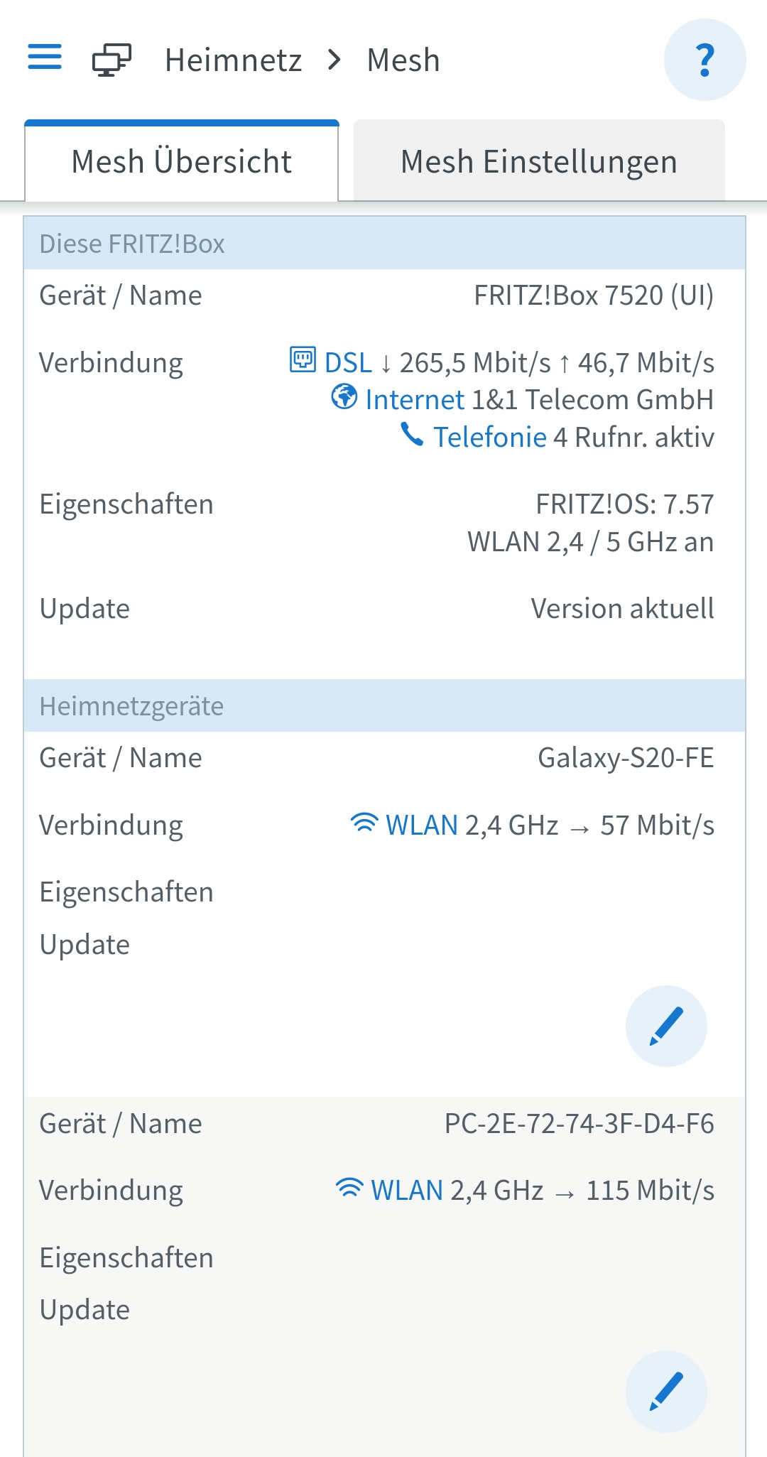 Für eine bessere Weitergabe des WLAN-Signals wäre der Repeater im 1. OG besser aufgehoben, der Theorie nach, ganz unten in der Nähe des PCs liefert er für den PC zwar ein starkes Signal, bekommt von oben aber vermutlich nur magere 25Mbit geliefert (muss in der Mesh-Übersicht zu sehen sein), ein WLAN-Desaster in meinen Augen (10% dessen was man erwarten könnte).