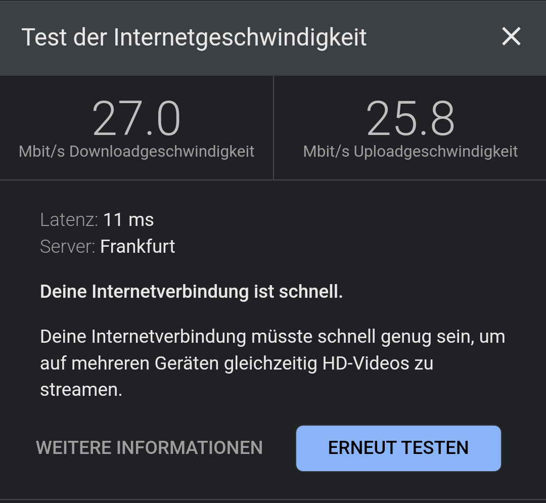 Schön dass Du 25 Mbit messen kannst, es sollten aber ca. 250 Mbit sein (down) und 42 MBit (up), von guter Verbindung ist hier NICHT die Rede.