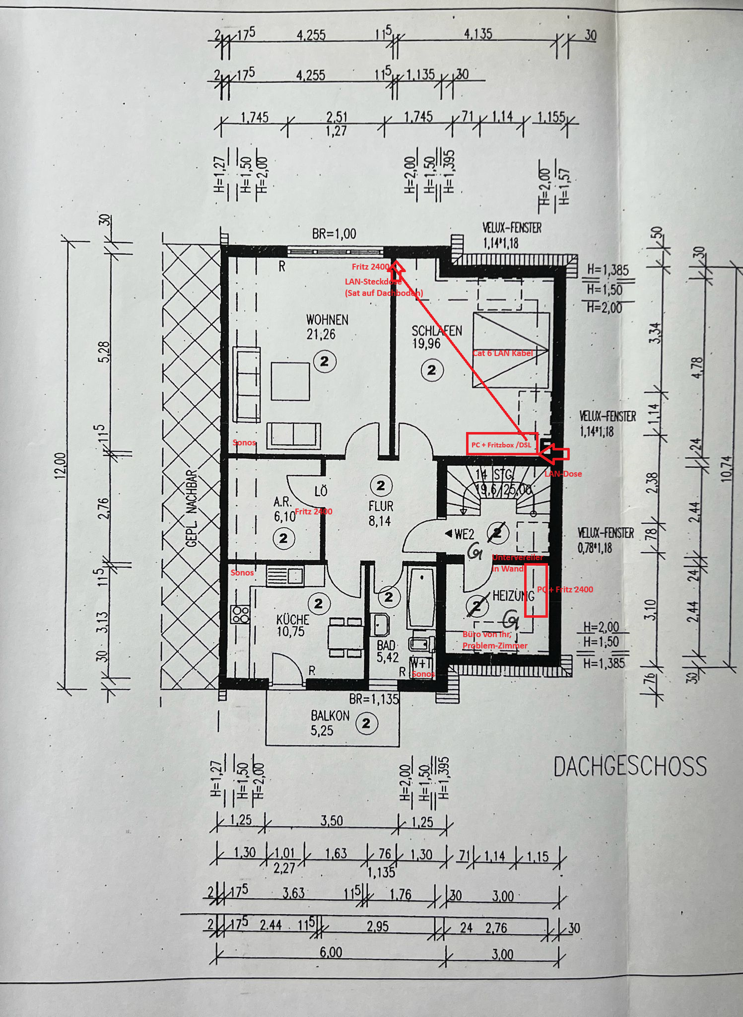 -2x verlegte Cat6 Kabel vom Schlafzimmer (wo DSL vom Keller ankommt) zum Wohnzimmer