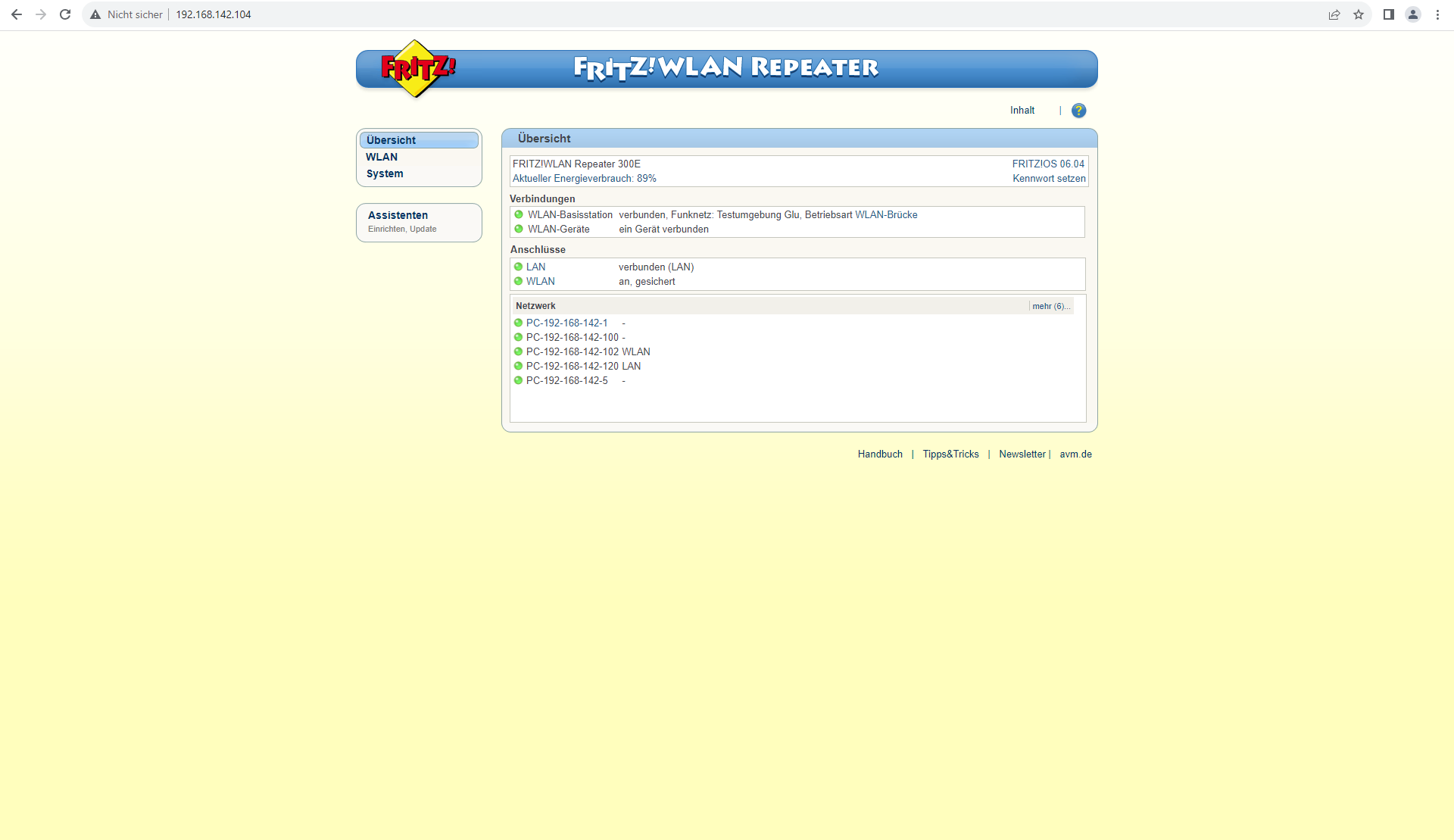 Offensichtlich hat der Repeater doch (via WLAN) Verbindung zu einem Netz (192.168.142.x), oder?