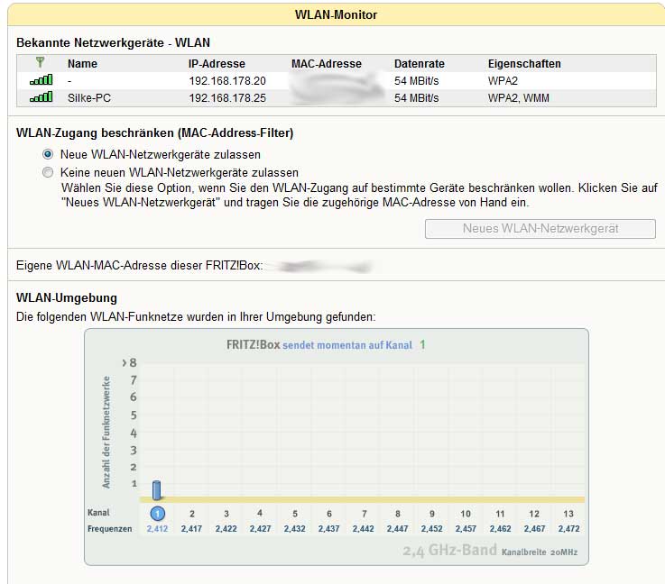 Alle Verbindungen sind hergestellt, im "Monitor" der Box erscheinen auch alle angemeldeten Devices, die Verschlüsselungen sind ok, die Sendeleistung der Box ist auf "max".