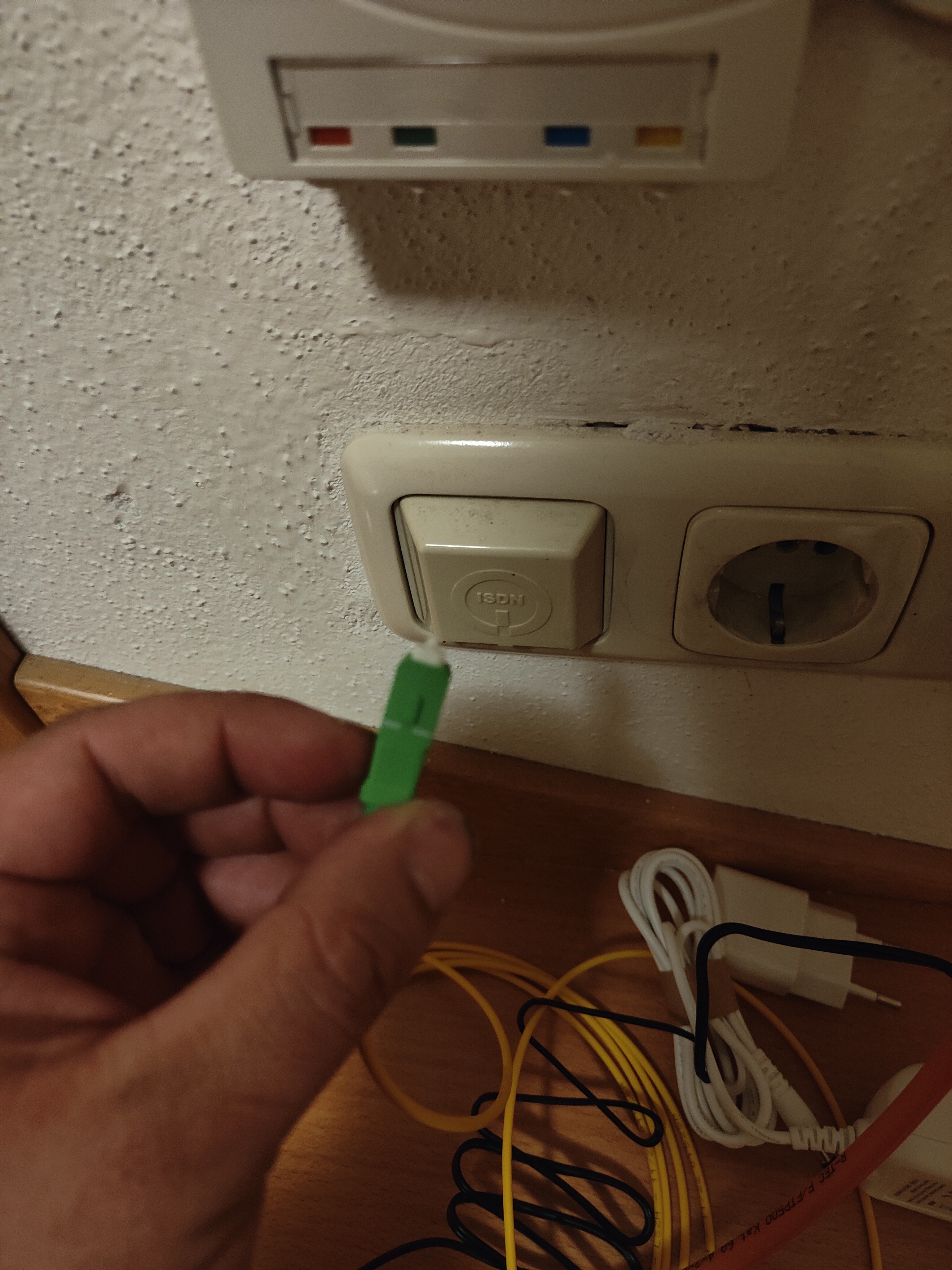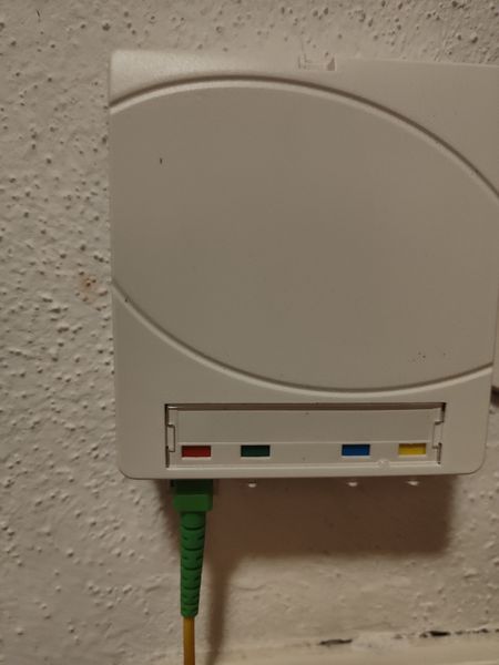Auf zu MediaMarkt, FritzBox gekauft, vorher beim Anbieter angerufen ob ich AON oder GPON brauche, der sagt GPON, also GPON Adapter in die Fritzbox, dann wollte ich das Glasfaserkabel wie beschrieben in unsere "Verteilerdose" anschließen wo bisher der Billig Router JM Fibre dran hing. Das Problem, das Kabel von der Fritzbox ist ein LC/APC (das habe ich dank Amazon inzwischen raus gefunden) und der Anschluss von der "Verteilerdose" ist aber SC/APC (dachte ich zumindest) und habe mir ein Kabel bei Amazon bestellt mit LC/APC auf der einen Seite und SC/APC auf der anderen Seite.