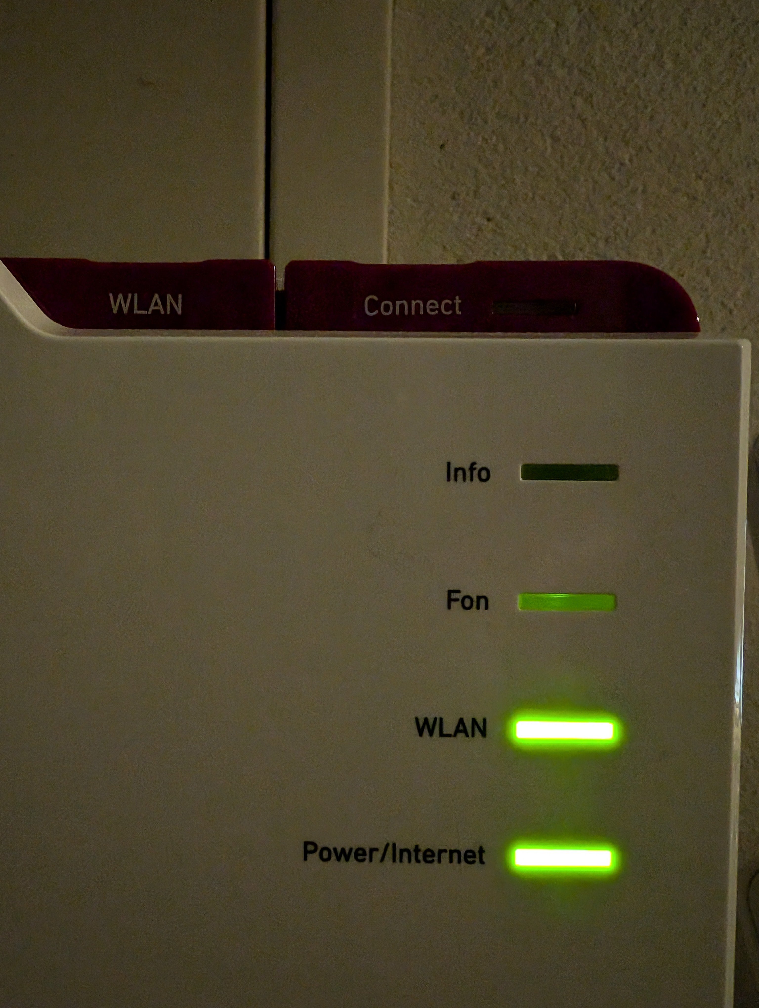 Bei meiner überstrahlen die LEDs, soll heißen, wenn die Power/Internet und WLAN-LED leuchten, leuchtet auch die FON-LED und sogar auch die Info-LED leicht mit.
