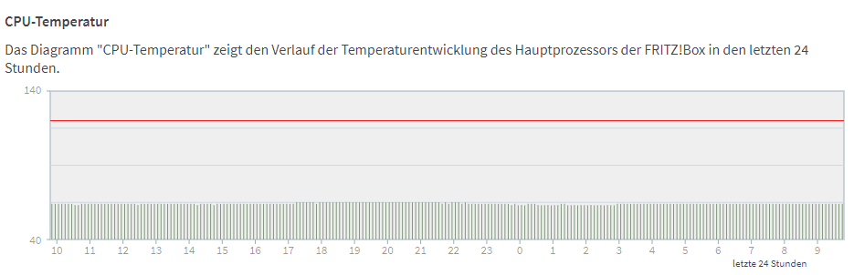 Danke - Leider ist nach dem Neustart der Temperaturverlauf wieder weg, aber mir fällt spontan auf, dass die CPU-Auslastung viel höher ist - Ich habe lediglich einen 10 GB Testdownload und Netflix gestartet. Die Temperatur scheint auch wesentlich stärker zu schwanken als bei dir. Ich werde meinen Vater mal fragen, die Fritzbox zumindest testweise anders aufzustellen, um ein Temperaturproblem auszuschließen: