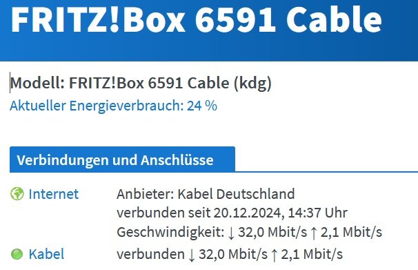 Zuerst einmal ist die FritzBox frei gekauft und wurde vom ortsansässigen Kabelanbieter modemseitig eingerichterlt, heißt der Internetzugang über diesen Kabelanbieter funktioniert grundsätzlich und es gibt auch einen eingerichteten Nutzer hierfür zwecks Updates im Anbieterbereich. Aktuell ist noch OS 7.57 aufgespielt.