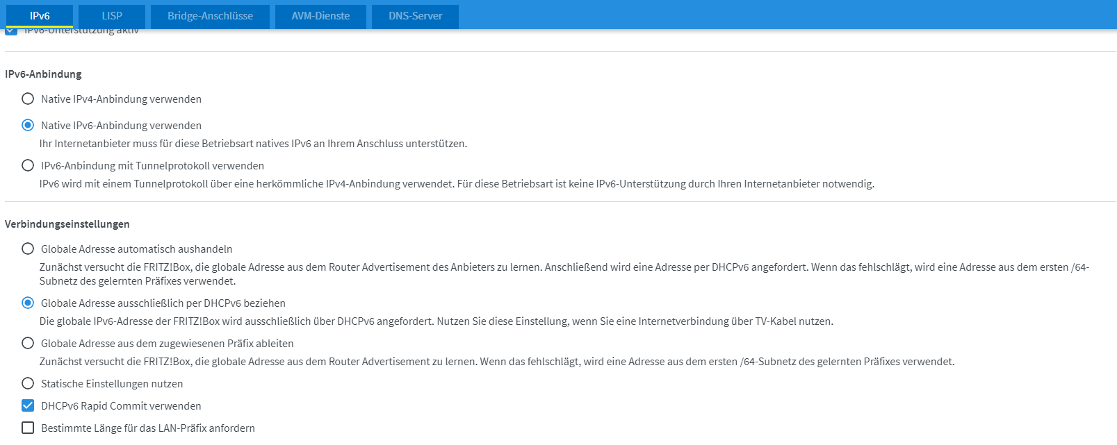 Die globale IPv6-Adresse der FRITZ!Box wird ausschließlich über DHCPv6 angefordert. Nutzen Sie diese Einstellung, wenn Sie eine Internetverbindung über TV-Kabel nutzen."