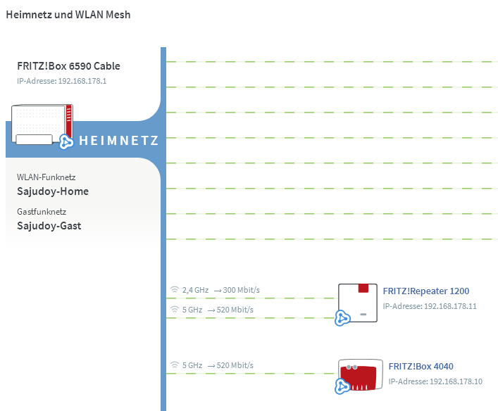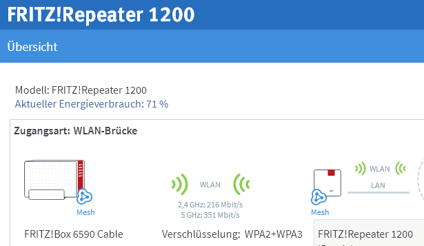 Nach meinem "Denken" arbeitet ja jeder Repeater nun als Sender und Empfänger. Korrekt? Im Menü der FritzBox sind zwei der Wlan Repeater mit dem 2,4Ghz und dem 5Ghz Netz verbunden - nur einer (hängt weit weg in der Garage) NUR mit dem 2,4Ghz Netz. Und hier auch "nur" mit 7 Mbit/s.