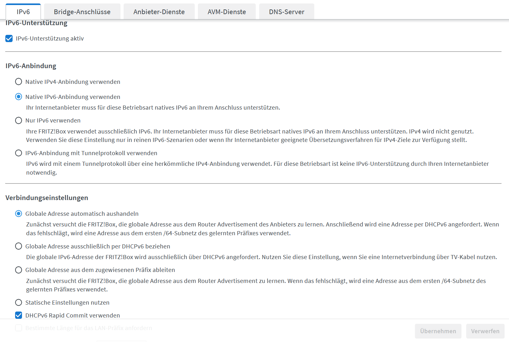 vielleicht hat jemand das selbe Problem und kann dazu mehr berichten, ich habe von Vodafone die FritzBox 6690 bekommen und sofort danach Dual-Stack aktivieren lassen. So wie ich das von den Screenshots herausnehmen kann ist es auch aktiv. Nun welche Einstellung muss den eingestellt werden das die Verbindung am besten funktioniert ? Ich konnte das nur beobachten das nach einer Box Neustart die Einstellung immer zurückgesetzt wird auf "Native Ipv6-Anbindung verwenden", auch wenn ich selber die Einstellung "Native IPV4-Anbindung verwenden" vorher aktiviert habe. Die Einstellungen werden also leider nicht gespeichert ...