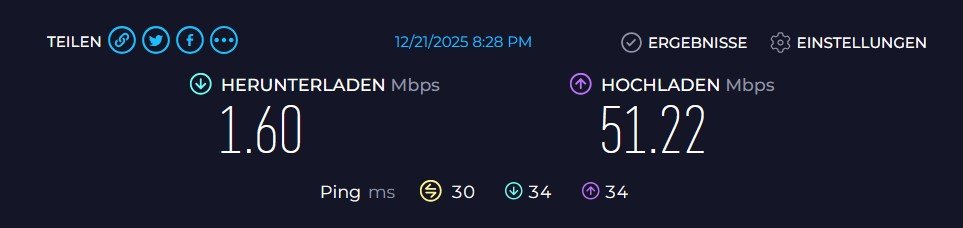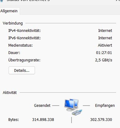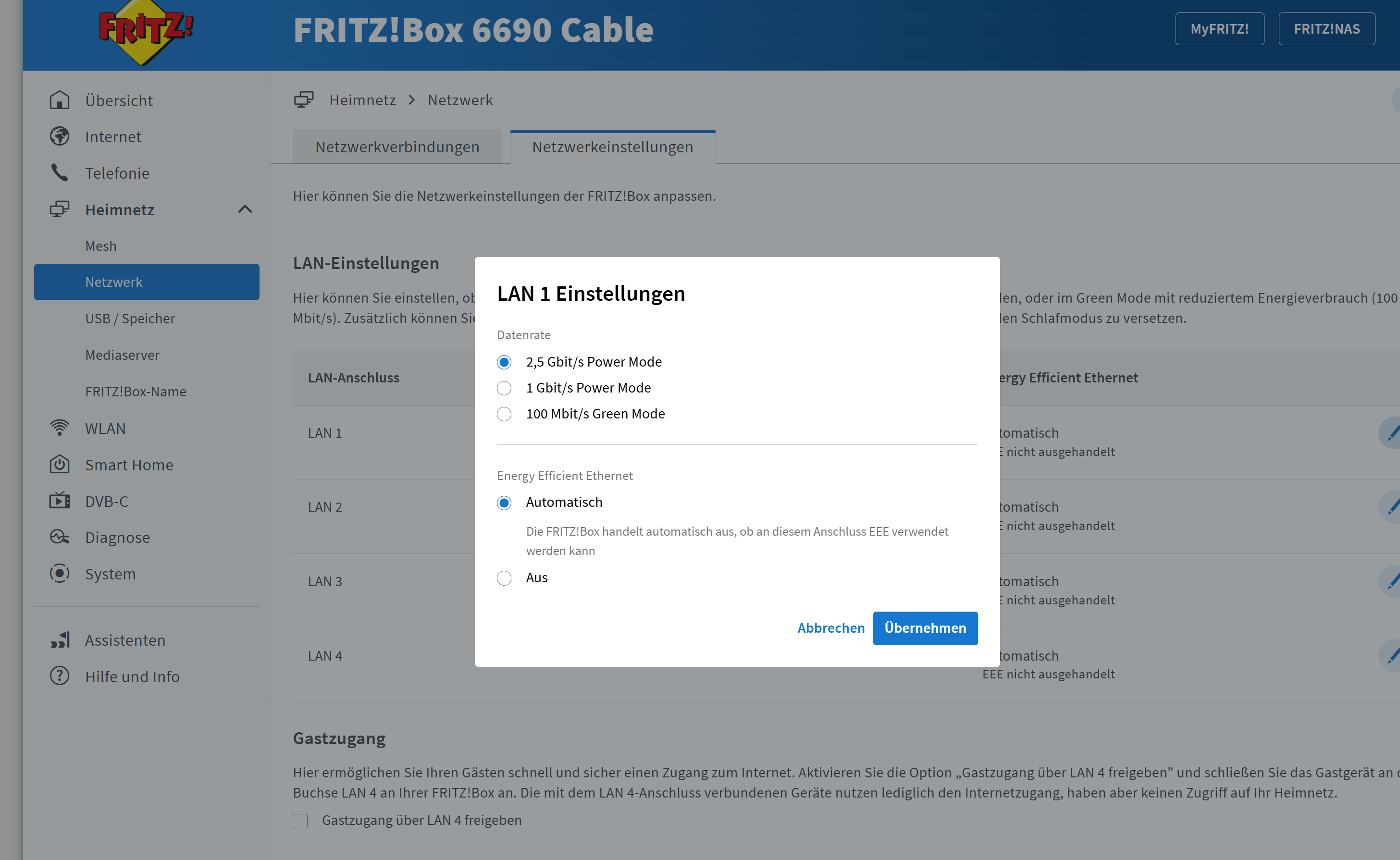 Der Rechner ist per LAN an der FritzBox angeschlossen. Um den Switch dazwischen auszuschließen, war ich auch direkt an der Box — ohne Veränderung. Kurios ist außerdem, dass über WLAN genau dasselbe passiert.